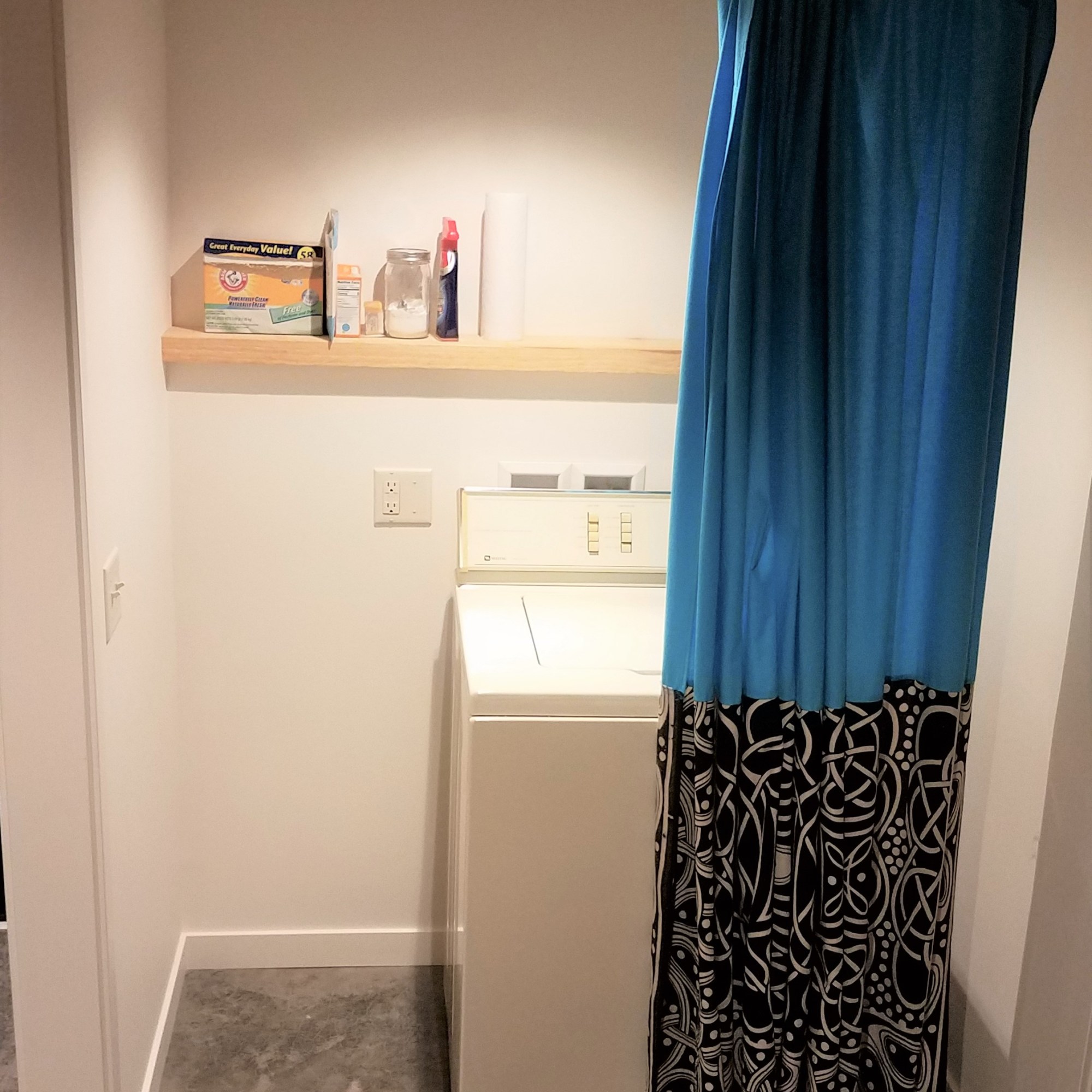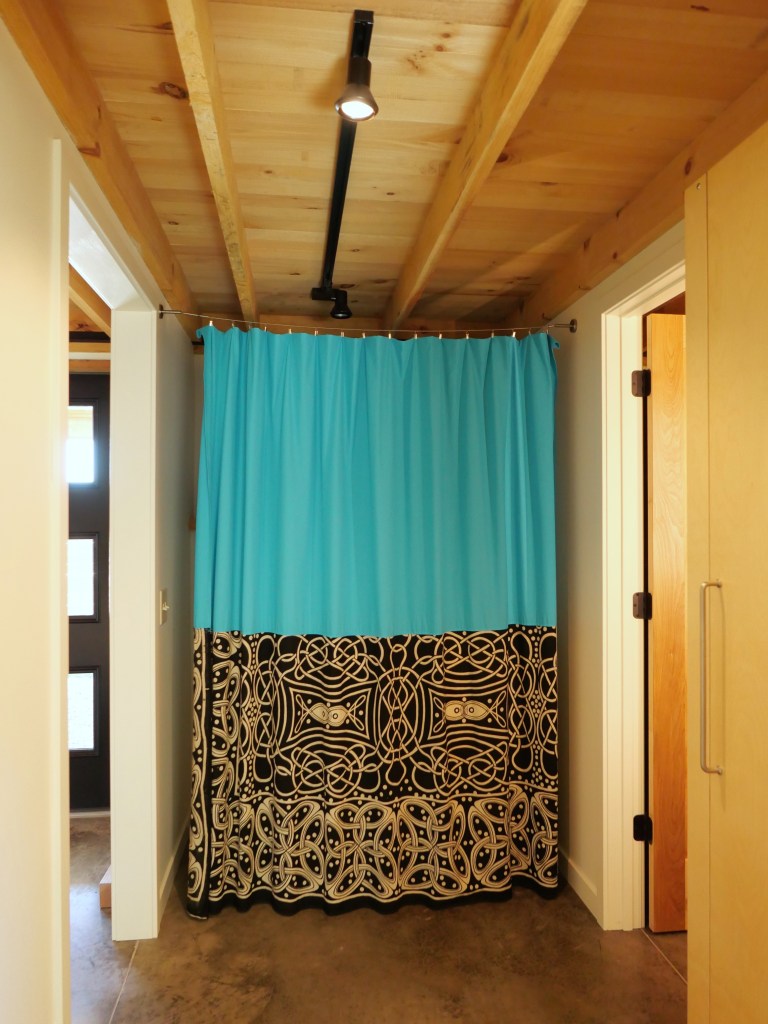 A small home like mine can live bigger with a few sleight of hands. My good friend Megan Fields of Rivendell Design Works sewed a curtain that when drawn back—voila!—reveals the washer. What was a small passageway between bedroom and bath becomes a generous working area for laundry sorting. Thank you Megan for finding just the right shade of blue!