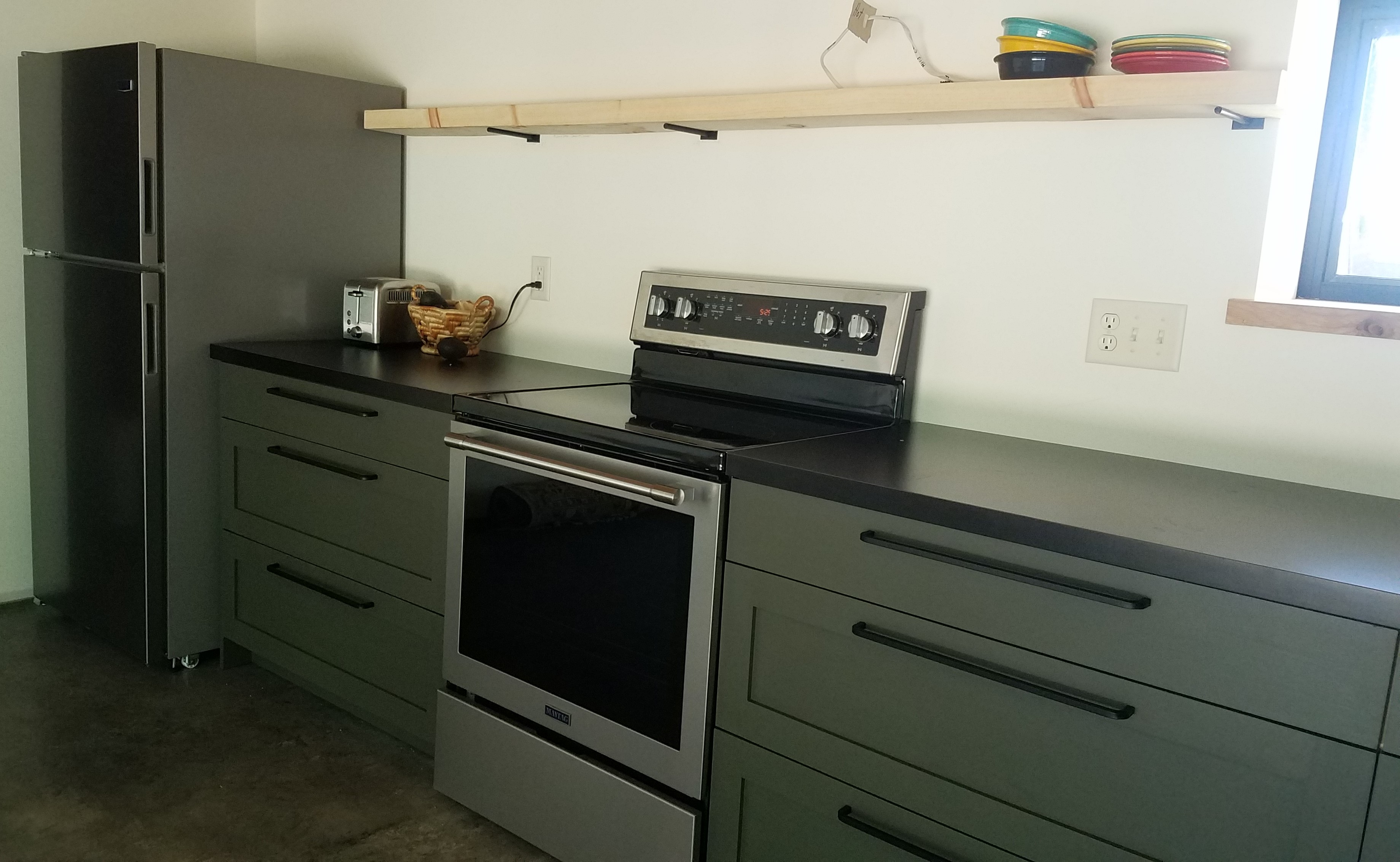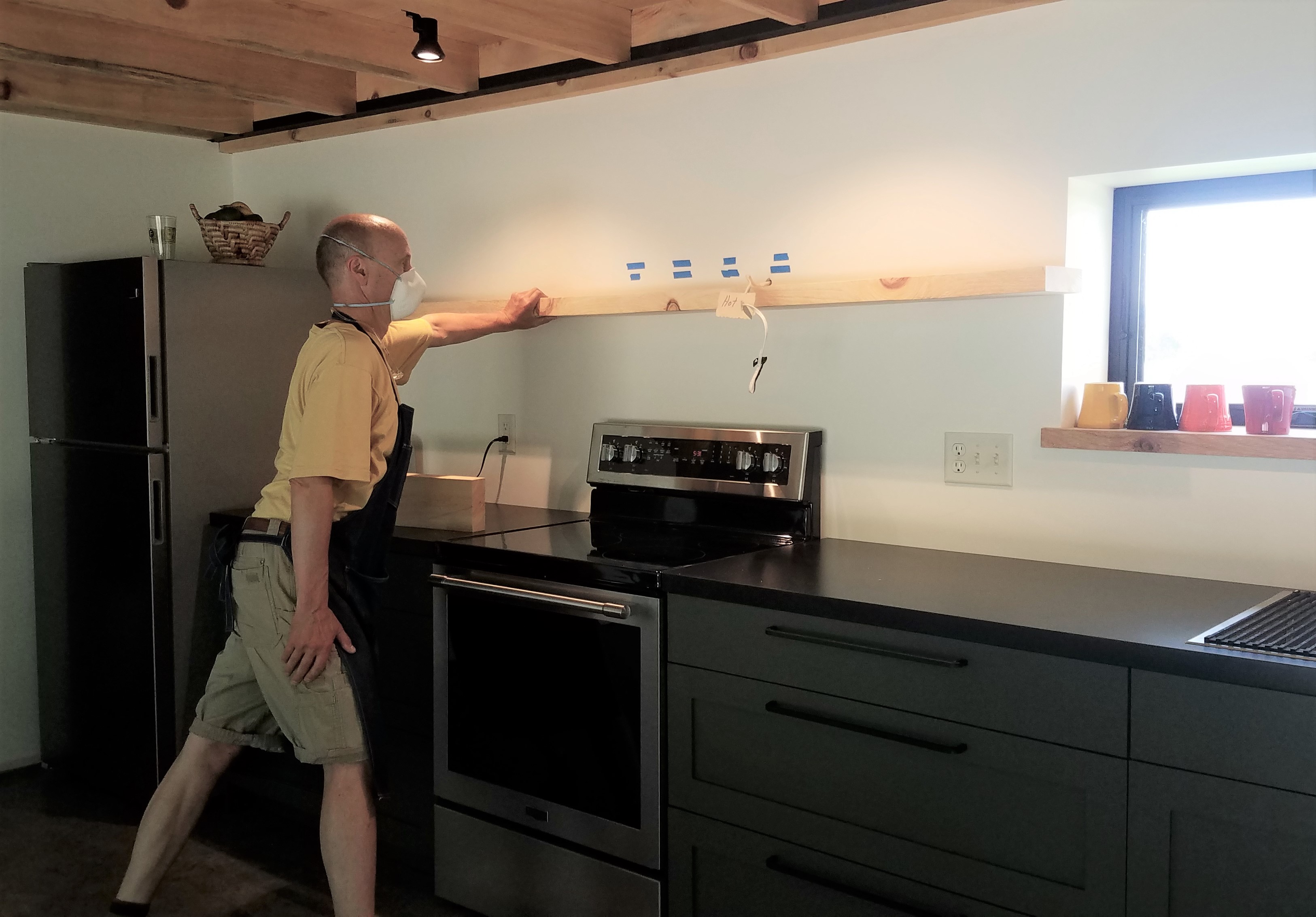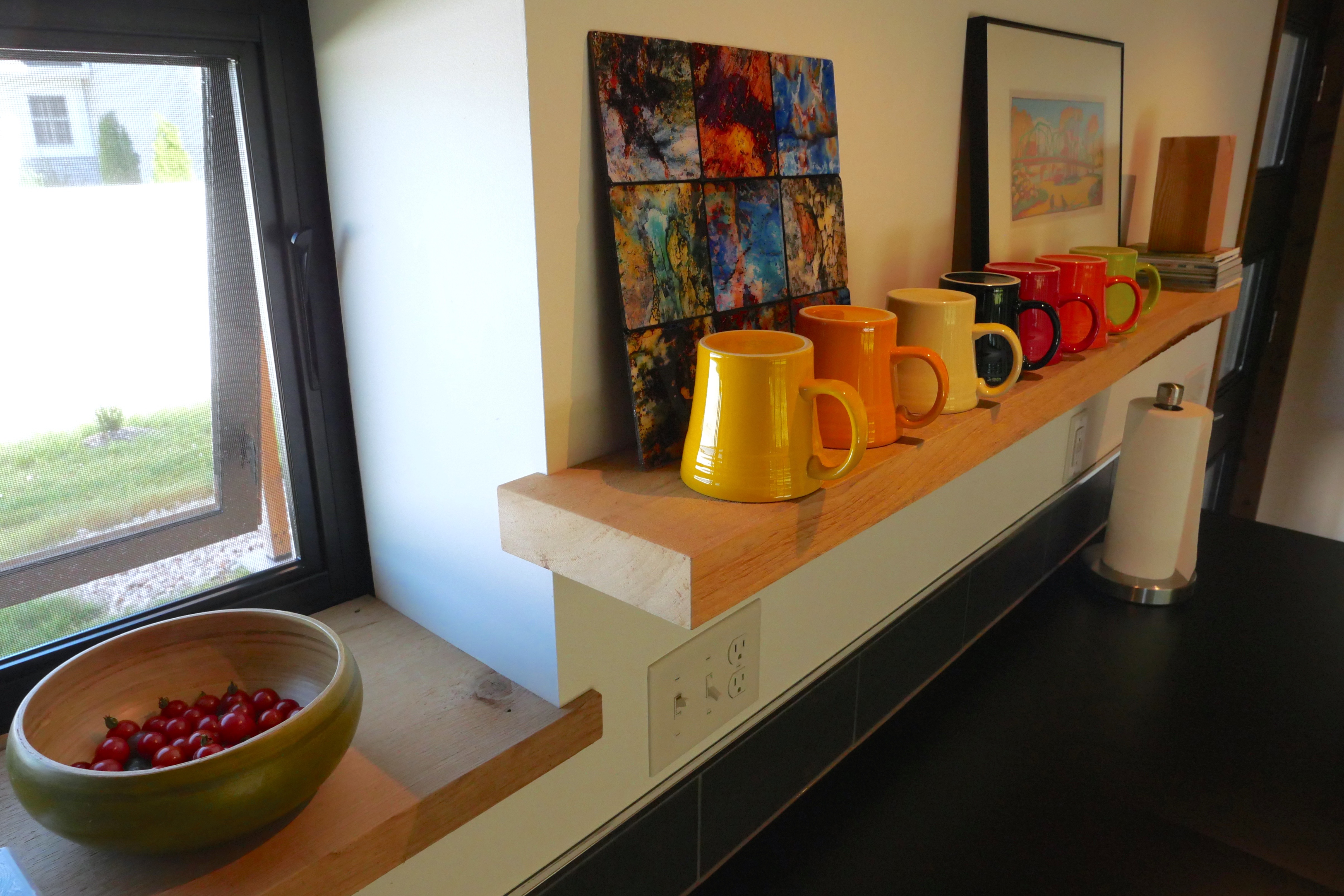 Leftovers were used for the kitchen’s floating shelves. My finish carpenter and friend Eric Wallner of WALLNER DESIGN-BUILD and I brainstormed the idea of hooking the ends around the drywall window jambs and setting one shelf high and one shelf low.
