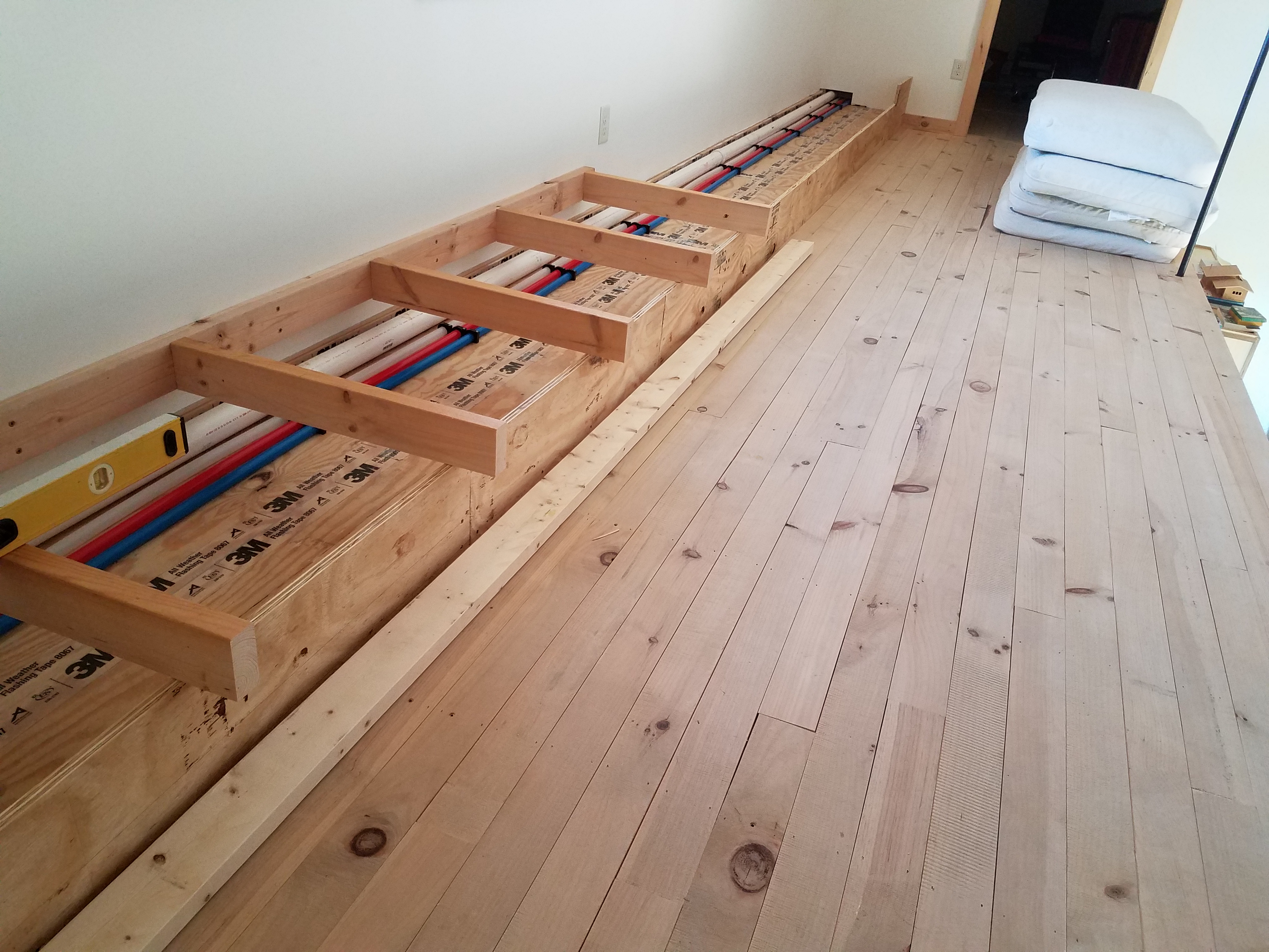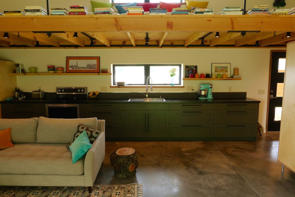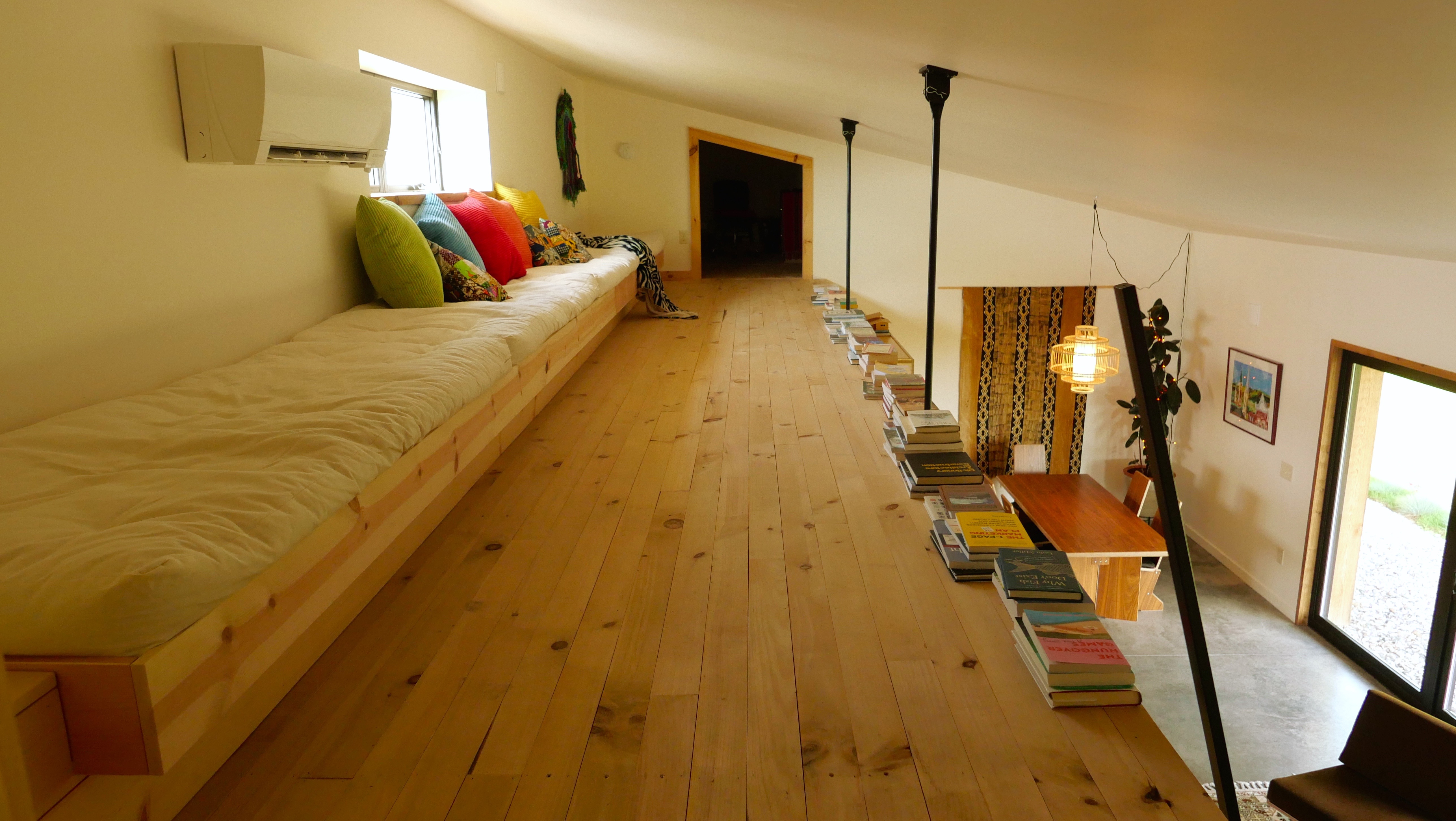 Throughout the build, I stacked siding cut-offs and 2x scraps in the garage and it was to this pile that I directed Eric when it came time to build the 27 foot long window seat along the back side of the loft (He did have to pick up a few sheets of plywood). His design is simple and elegant. The seat floats above the mechanical chase and juts back at the ends to create tabletops. Custom cushions were too pricey, so after some online searching I found narrow futons (sold as RV mattresses) with a non-toxic mix of cotton and poly fibers, wrapped in a zippered cotton canvas. What was a walk-through space is now transformed into a place to read and lounge and gaze down at the garden.