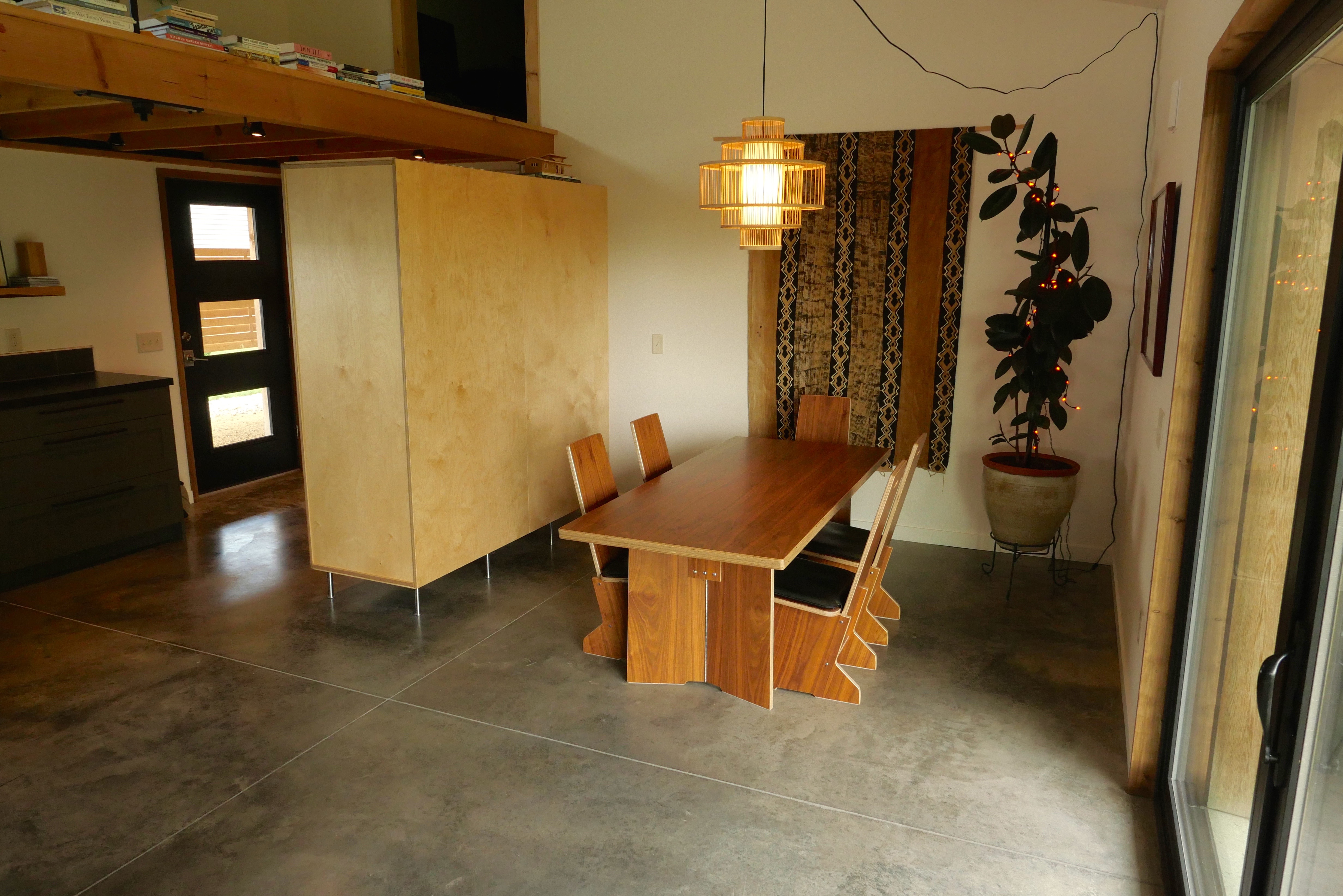 Window sills are extra-thick planks of rough-sawn cedar (ordered from the lumberyard). They visually extend to the exterior sill that acts as a drip cap above the course of lower lap siding. Ditto for the door jambs—a visual trick that channels Frank Lloyd Wright who famously set panes of glass into grooves cut into stone to “dissolve” the barrier between indoors and out. I was adamant about keeping the texture, but Eric wisely counseled that a light skip-sanding would take down the splinters. A damp cloth run over the surface is all that’s needed to wipe away dust.