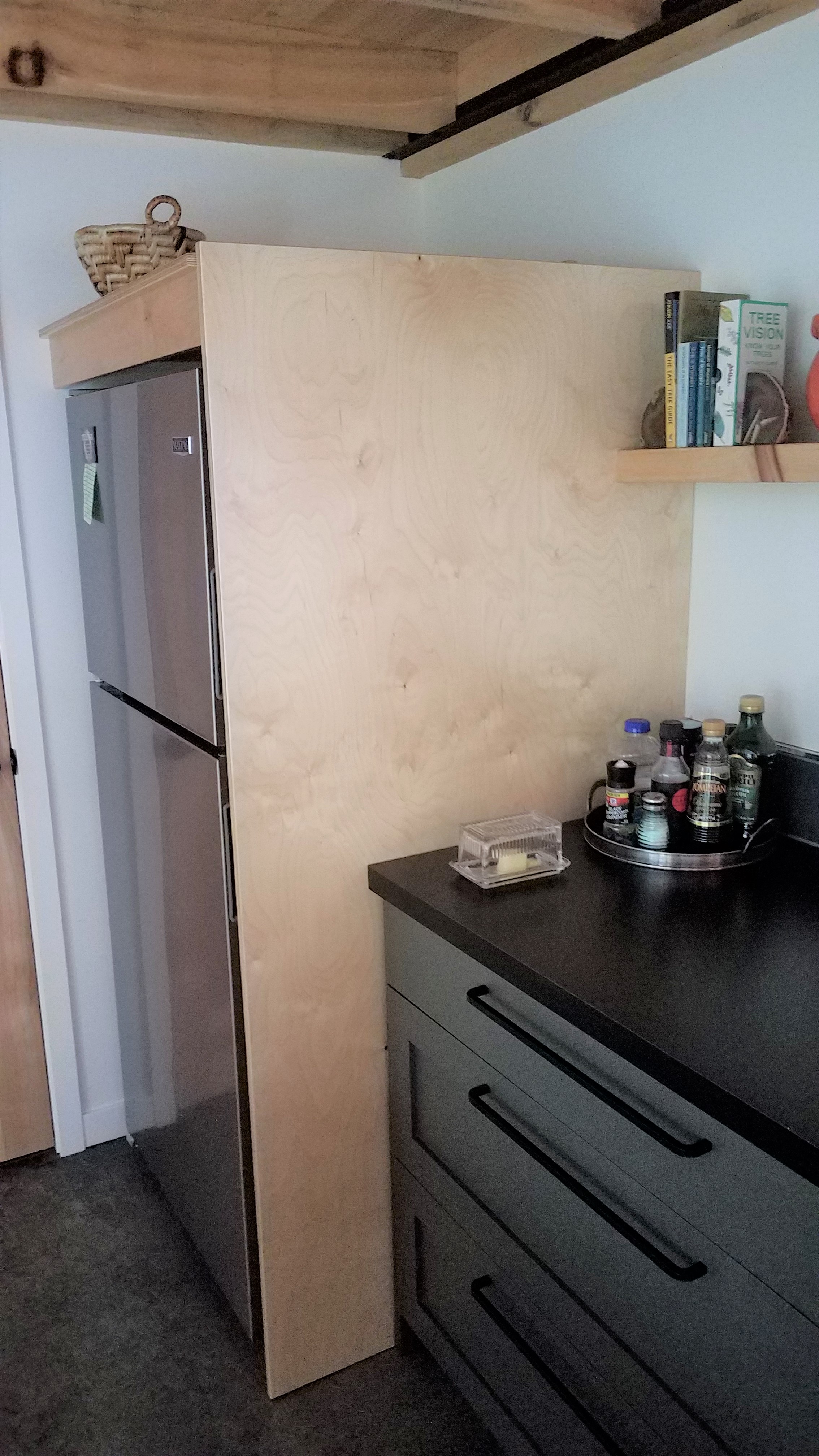 A pet peeve (designers relish pet peeves) are bulky refrigerators. With my budget, I couldn’t consider a cabinet-depth refrigerator or even an attractive one that could stand on its own merits. Instead, I asked Eric for a plywood wrap that would complement the unit he built for the entryway. He devised this attractive and smooth-as-silk built-in in a way that can be minimally altered should the refrigerator be replaced with a larger one. He used 3/4” thick 11 ply formaldehyde-free Purebond birch plywood, tweaking the design and edge-gluing where needed to minimize waste. A not-to-be-underestimated advantage of a refrigerator panel is that it eliminates a crumb gap.