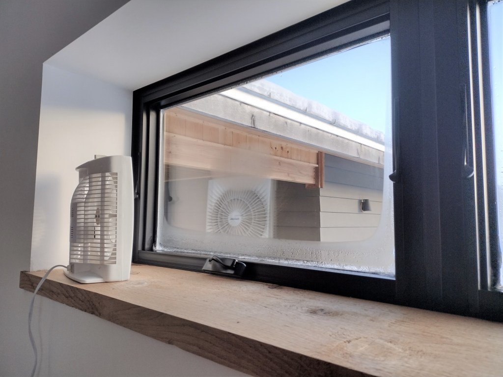 Dave moved into his new house next door last fall. It’s very similar to mine: slab on grade, 12″ thick double stud walls with dense pack cellulose, a super-insulated ceiling, Marvin fiberglass windows with standard glazing, and MemBrain installed as an interior air barrier. He heats with a Mitsubishi Air Source Heat Pump (ASHP) like mine and brings in fresh air with a Lunos Heat Recovery Ventilator (HRV) like mine. But he’s had no window condensation and certainly no icing.