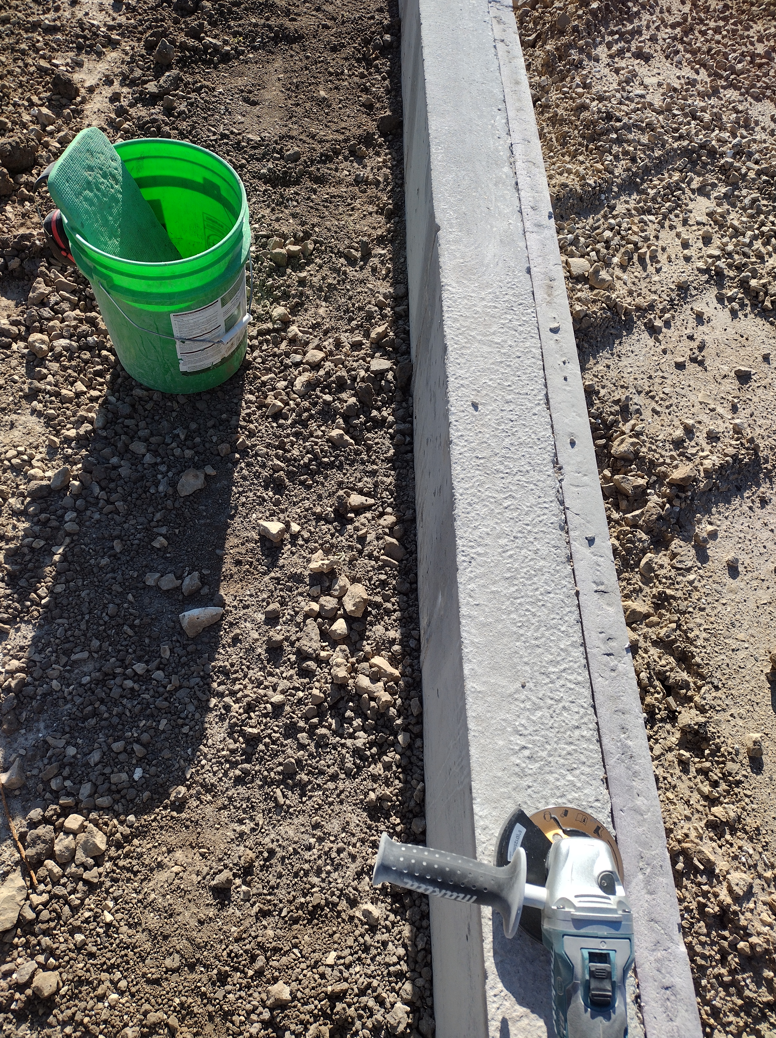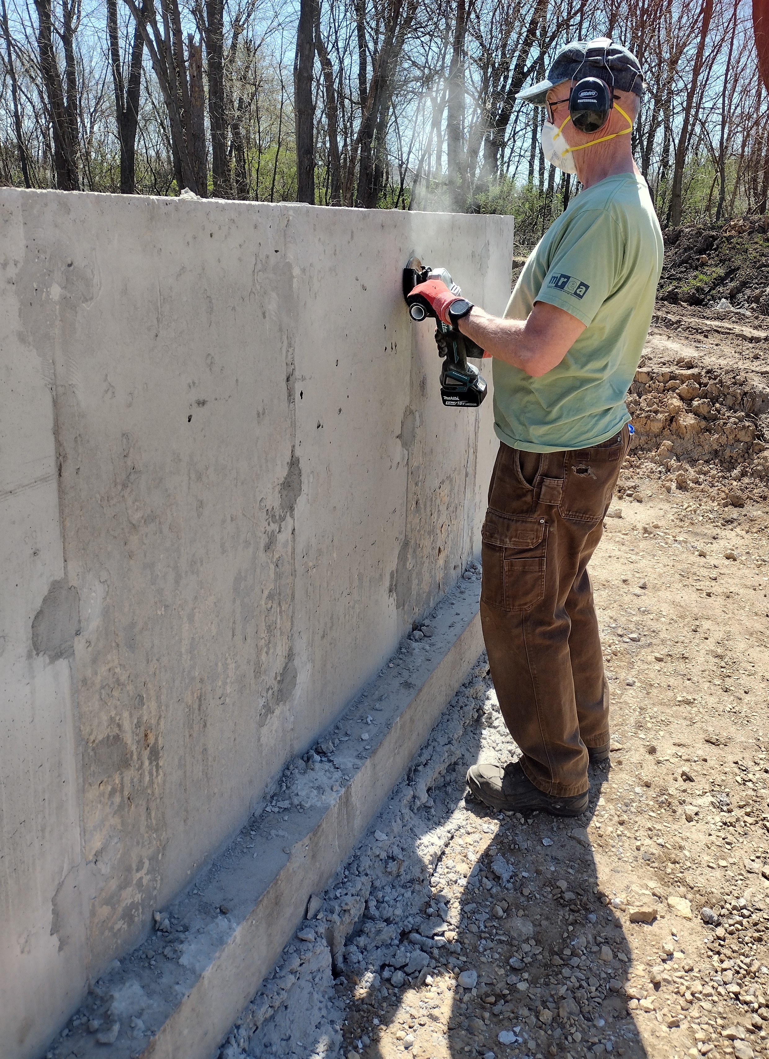 Our second Weekend Warrior Work Day found us (Glenn, JC, Laura, and me) knocking off form ties, grouting the holes left behind with hydraulic cement, then grinding our handiwork smooth. Later, I spent many a miserable hour grinding the top of the wall smooth of bumps and dips (it had rained shortly after the pour).