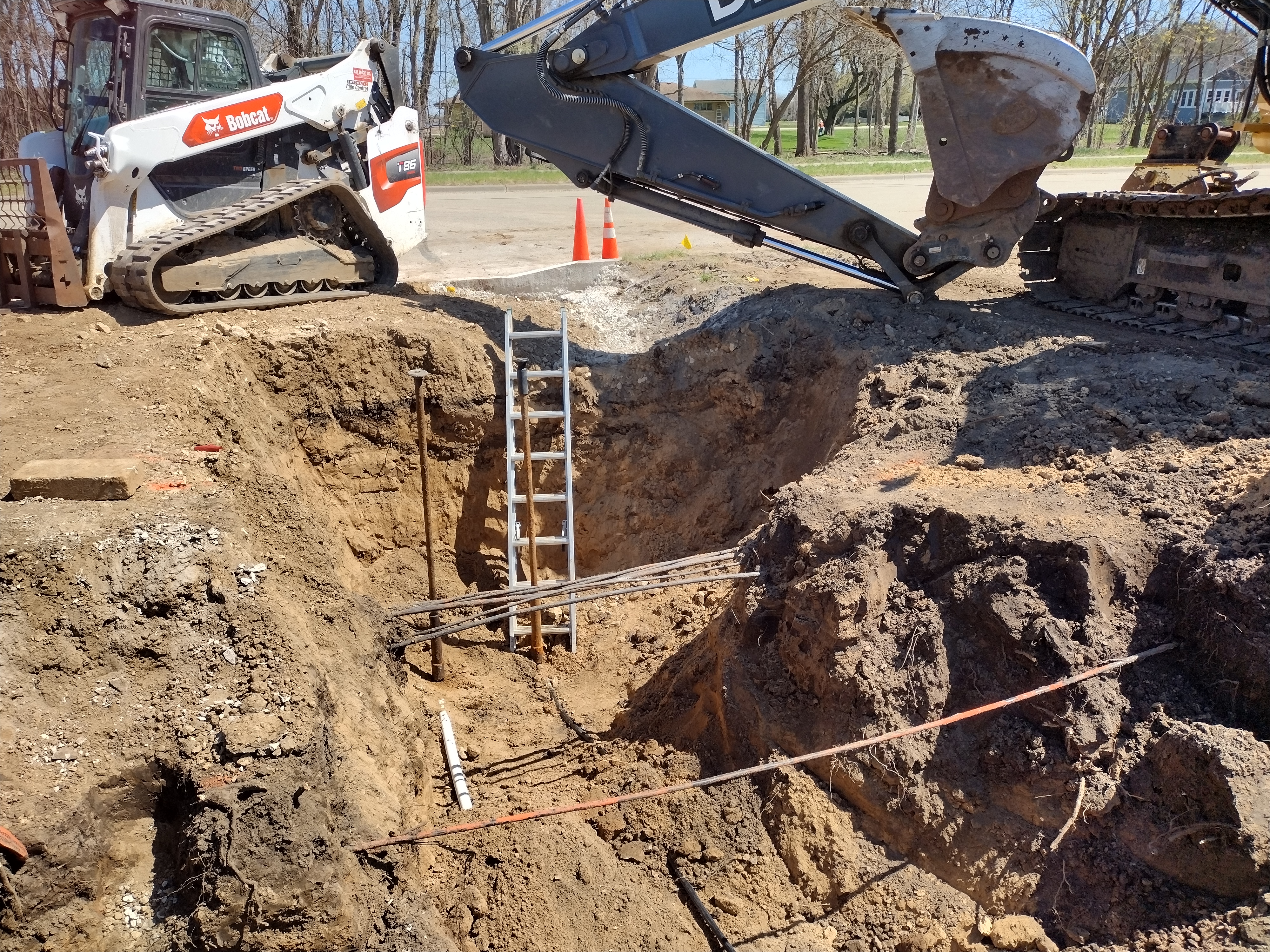 Plumbers Lance and Luke arrived from Collins & Hying to install the laterals, with the help of Shawn Slaney the excavator. Laterals are the pipes that connect the Village water and sewer lines to my house via the green PVC tube placed before the footings were poured. They had to work under and around many electrical and communications wires.