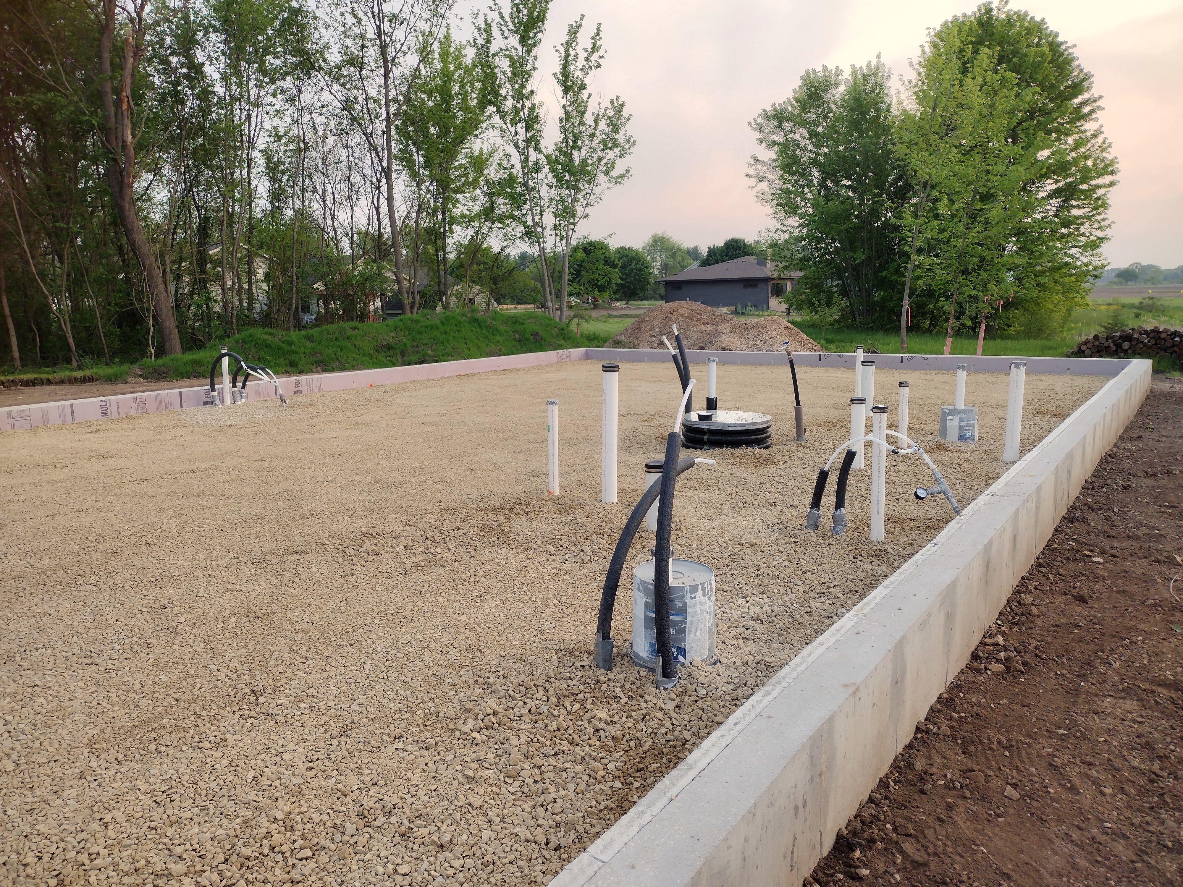 The water and sewer lines run to a grinder pump—an unfortunate expense that all homeowners in my subdivision must bear. The plumbers returned after the foundation was filled in and stubbed drains and vents, followed by “the waters”.