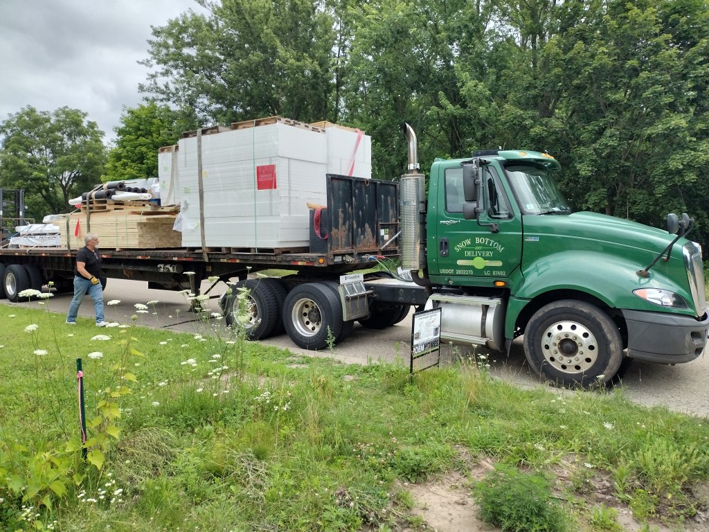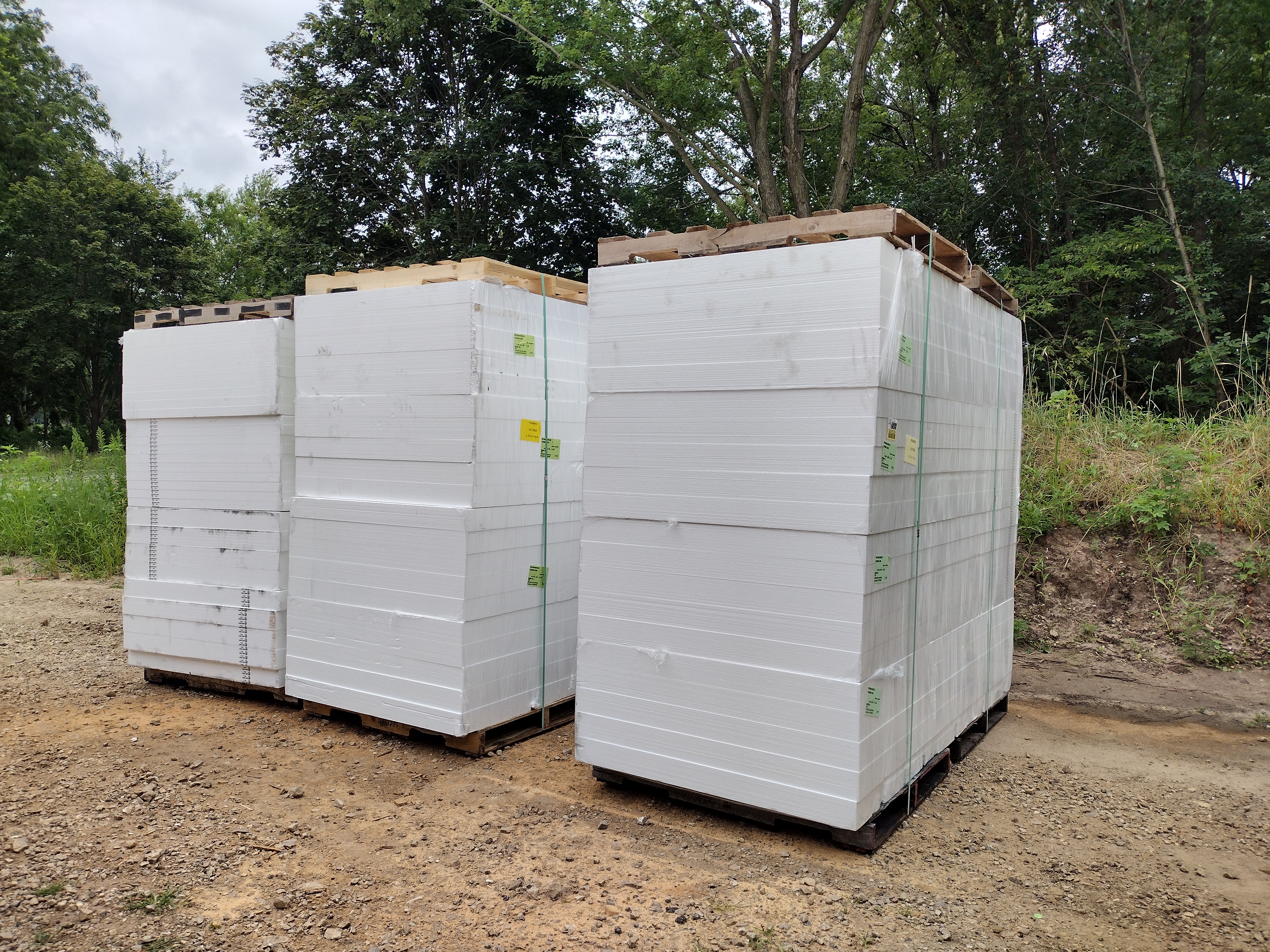 For slab insulation, I special ordered several pallets of InsulFoam Type II EPS (expanded polystyrene) sheet foam, in 4″ thickness for the house and 2″ thickness for the garage. Lumber yards and regional suppliers in the Madison area stock XPS (extruded polystyrene), but EPS is an anomaly. For convenience, I’d used XPS on my previous build but this time around, I wanted to do better.