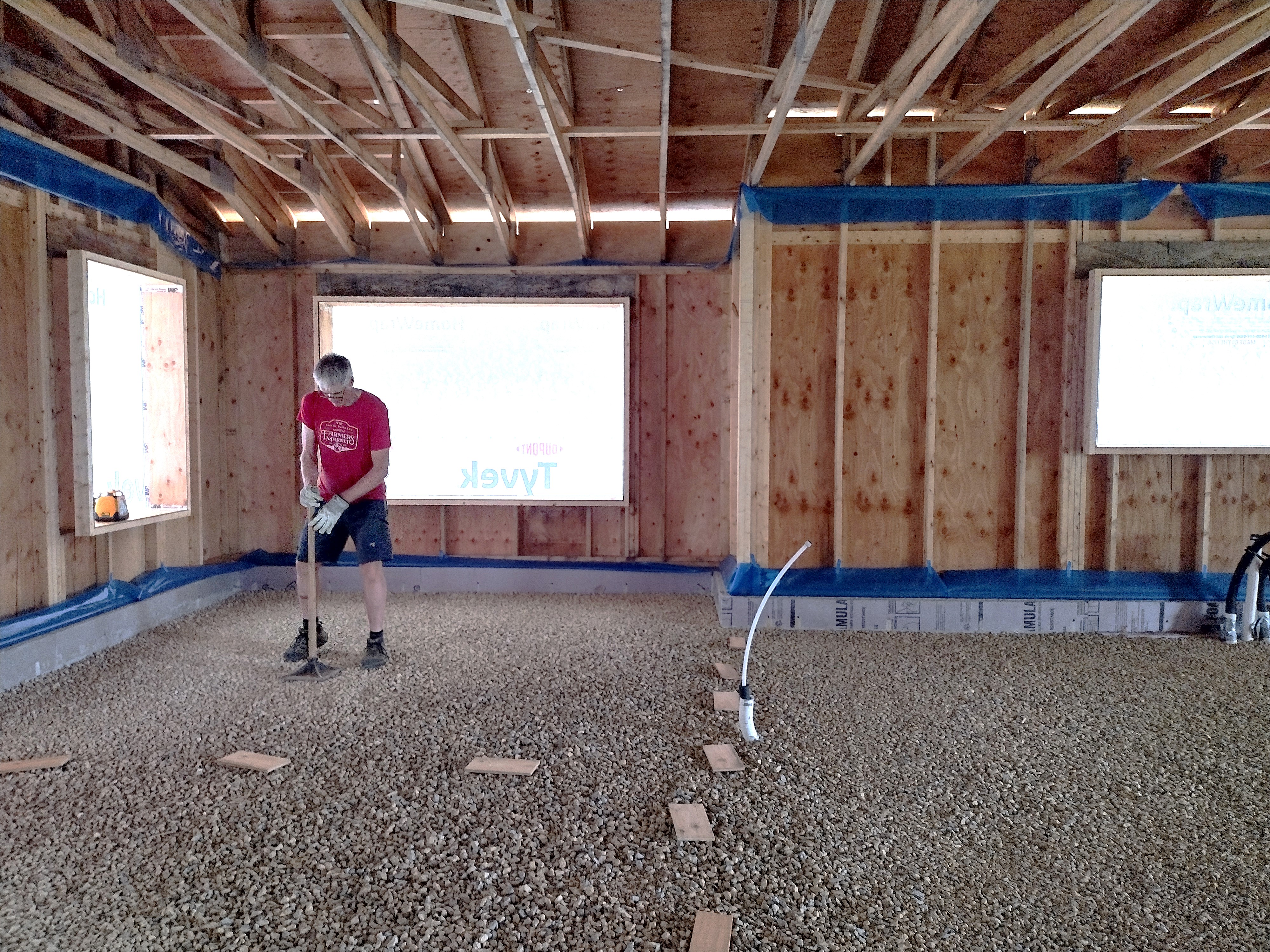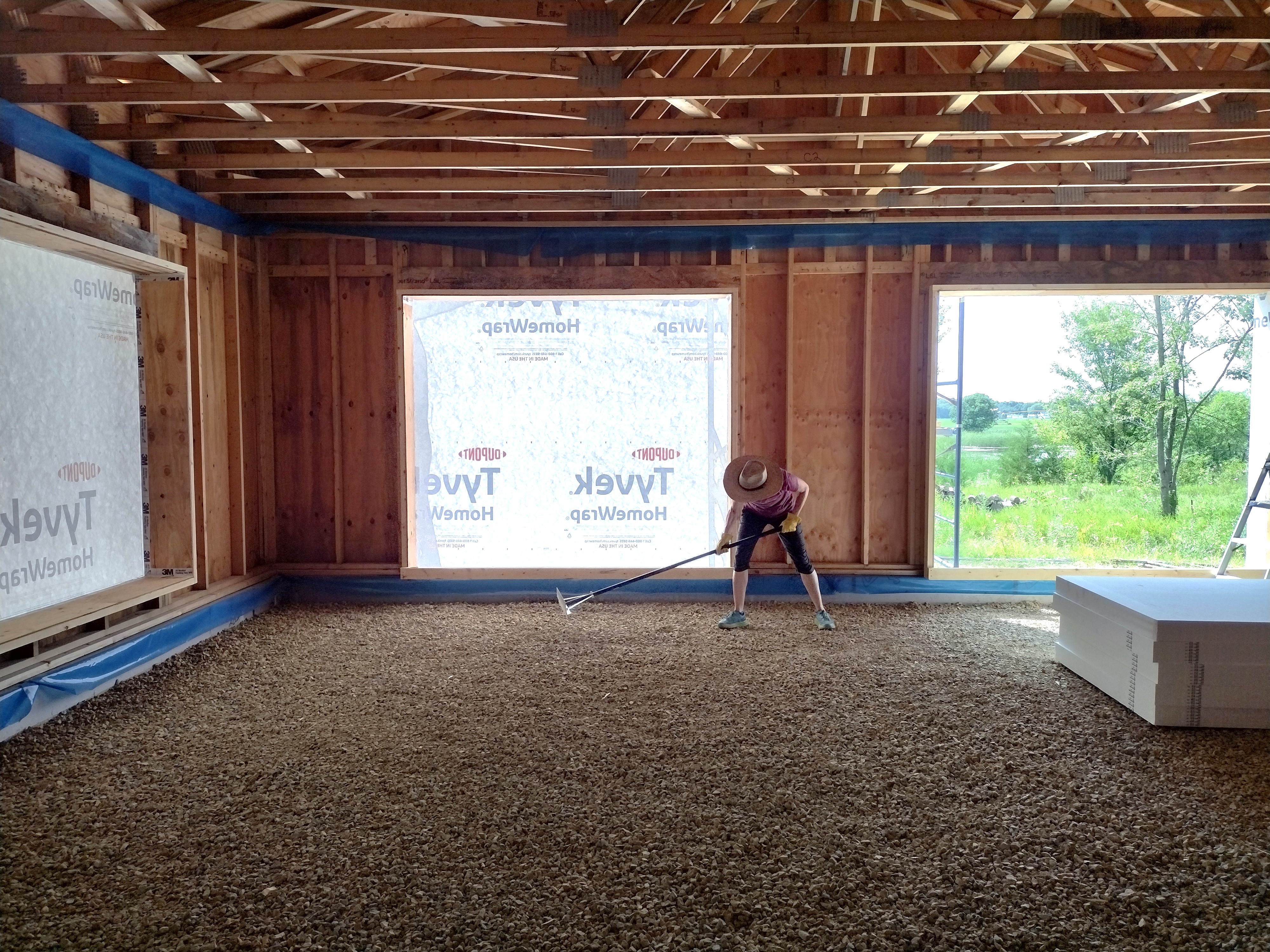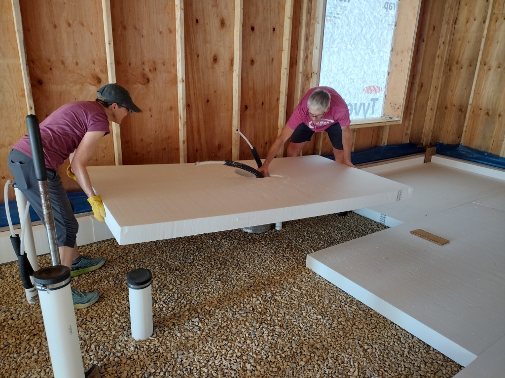 Our crew’s first task was to rake level and smooth out the gravel laid down by the excavator for a radon bed (see previous blog post Up and Out of the Ground). We used a laser level for overall “good”, then our eyes to finesse. Tamping was an essential (and hard) step but necessary to get the sheets to lay flat. I was tempted to order in a load of pea gravel after spreading and raking out a trial batch of it on top of the rough stone. The foam sheets did rest easier, but the extra step and expense was nixed in favor of soldiering on. Later, when laying the 2″ thick sheets for the garage, I found that tamping wasn’t as critical, as the thinner sheets could more easily “ride” the rough stones and occasional dips.
