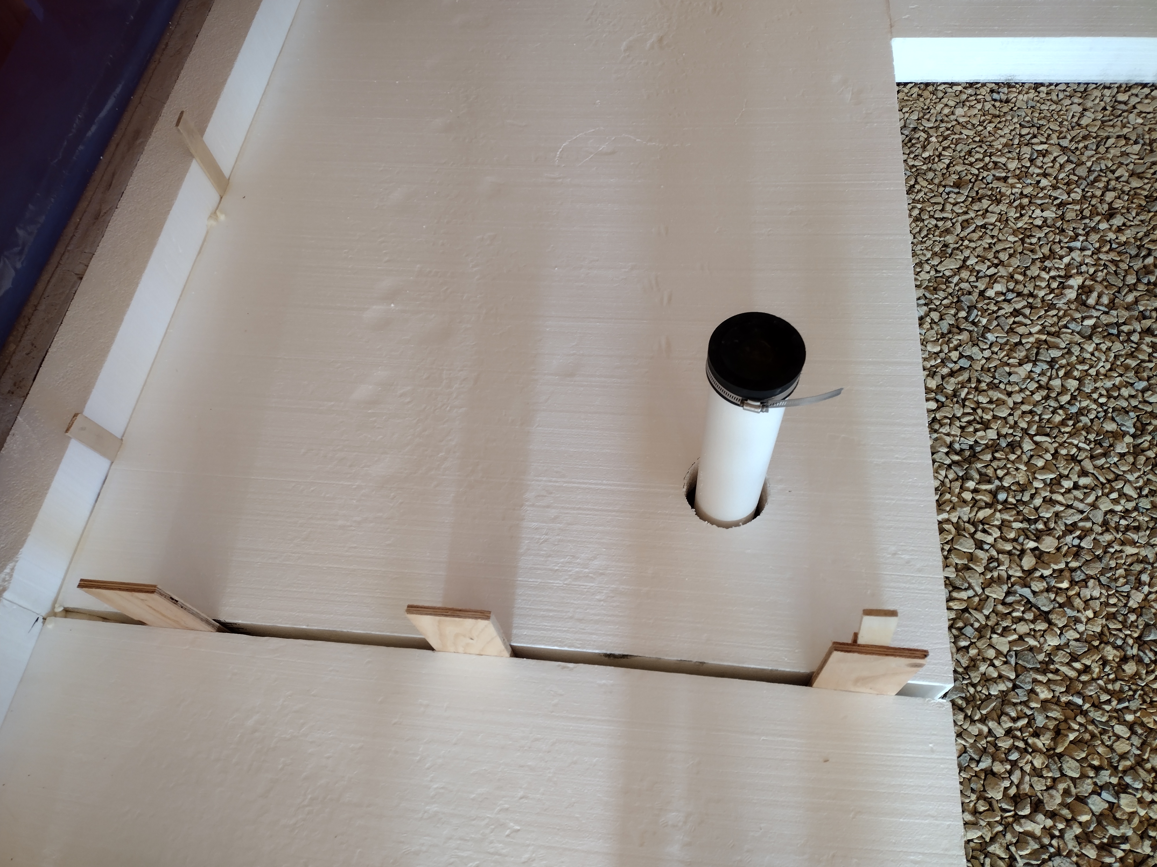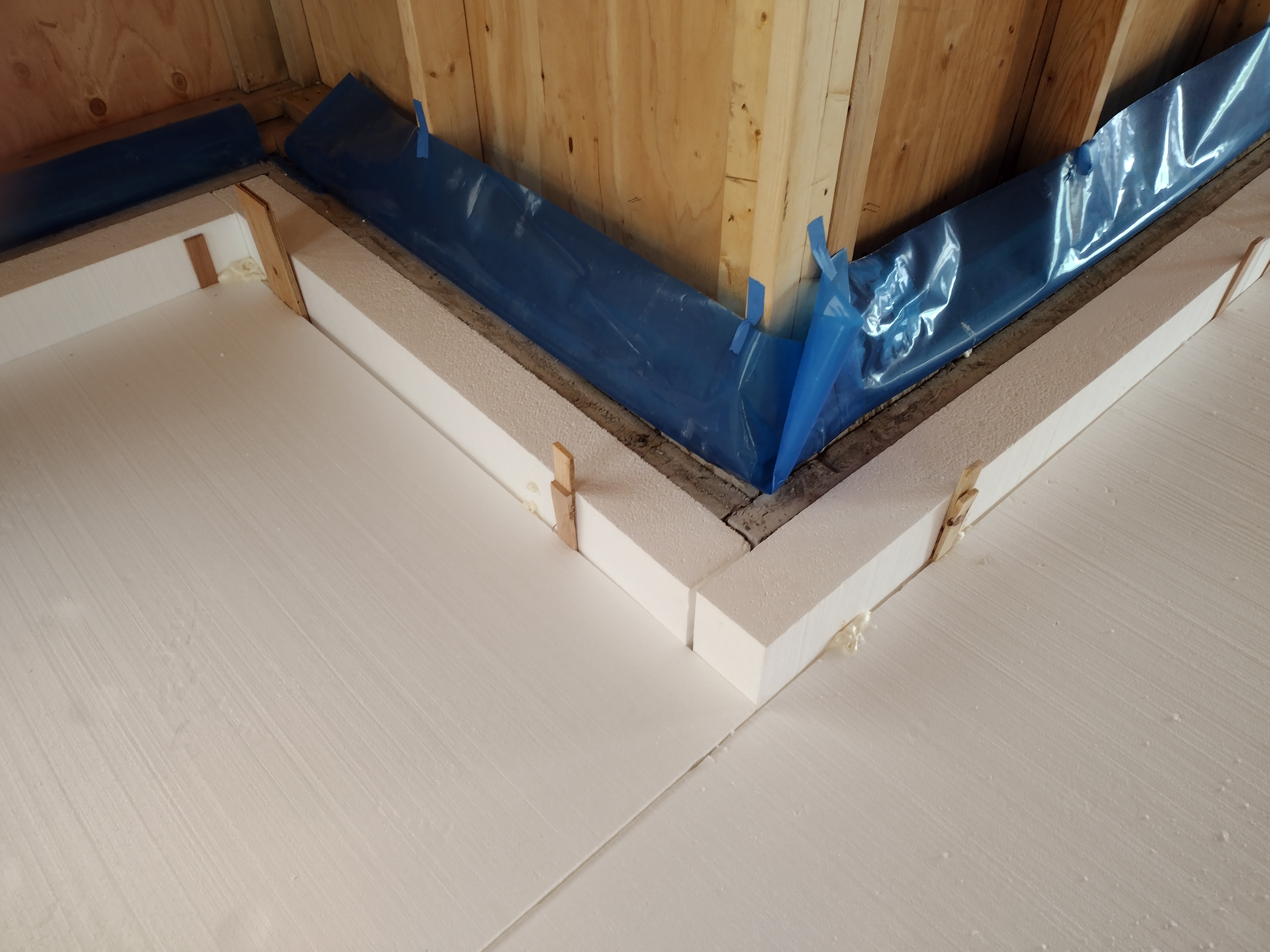 Here you can see the 6 inch thick foam perimeter: 2 inches of pink XPS installed as a reverse brick ledge in the foundation forms (see Footings + Foundations) plus the 4″ EPS strip for a total R-value of 28. This detail is possible because it will be completely covered by the 12″ wide double stud wall we will be building. The 4 inch under-slab foam has an R-value of 19.