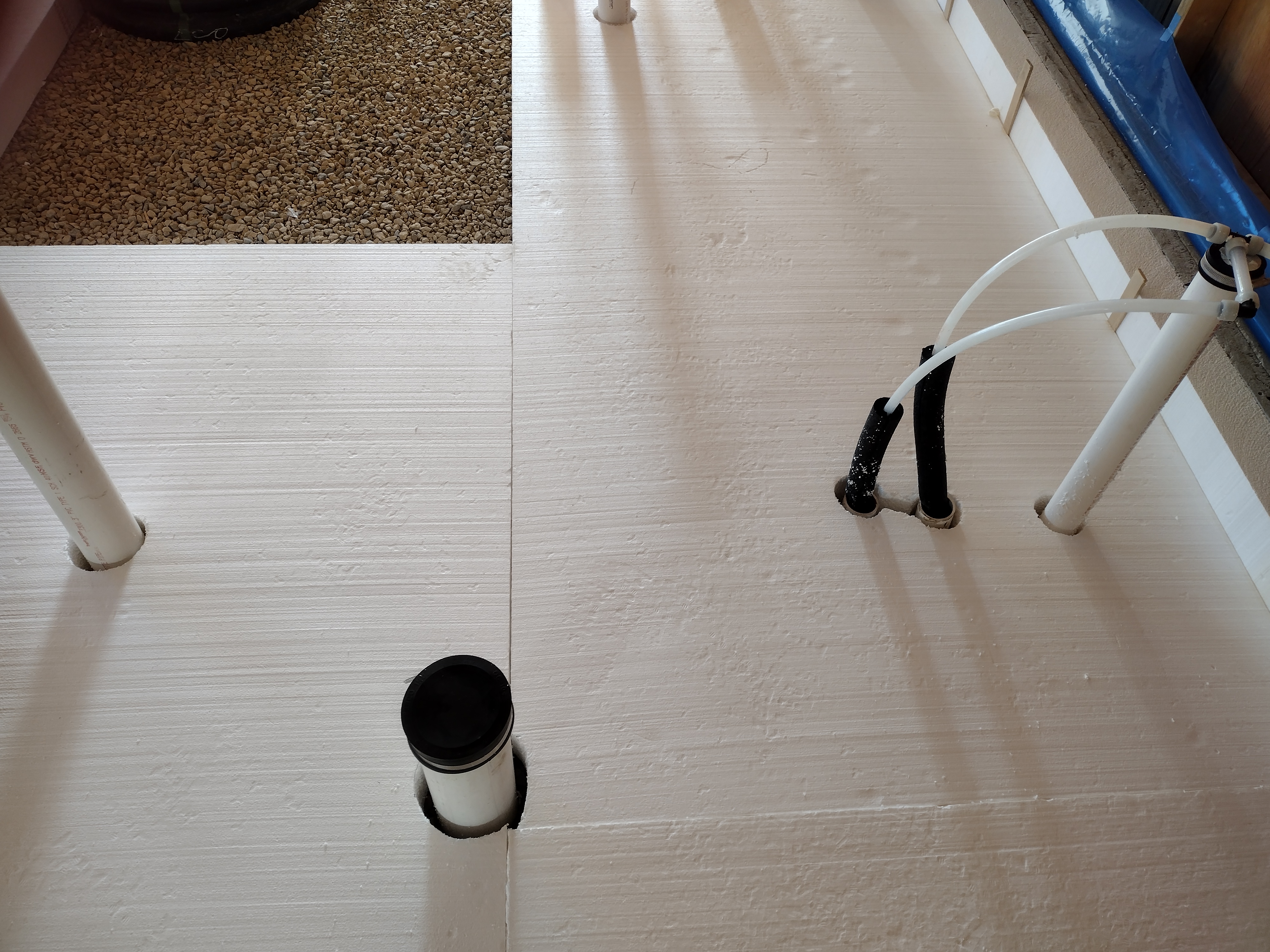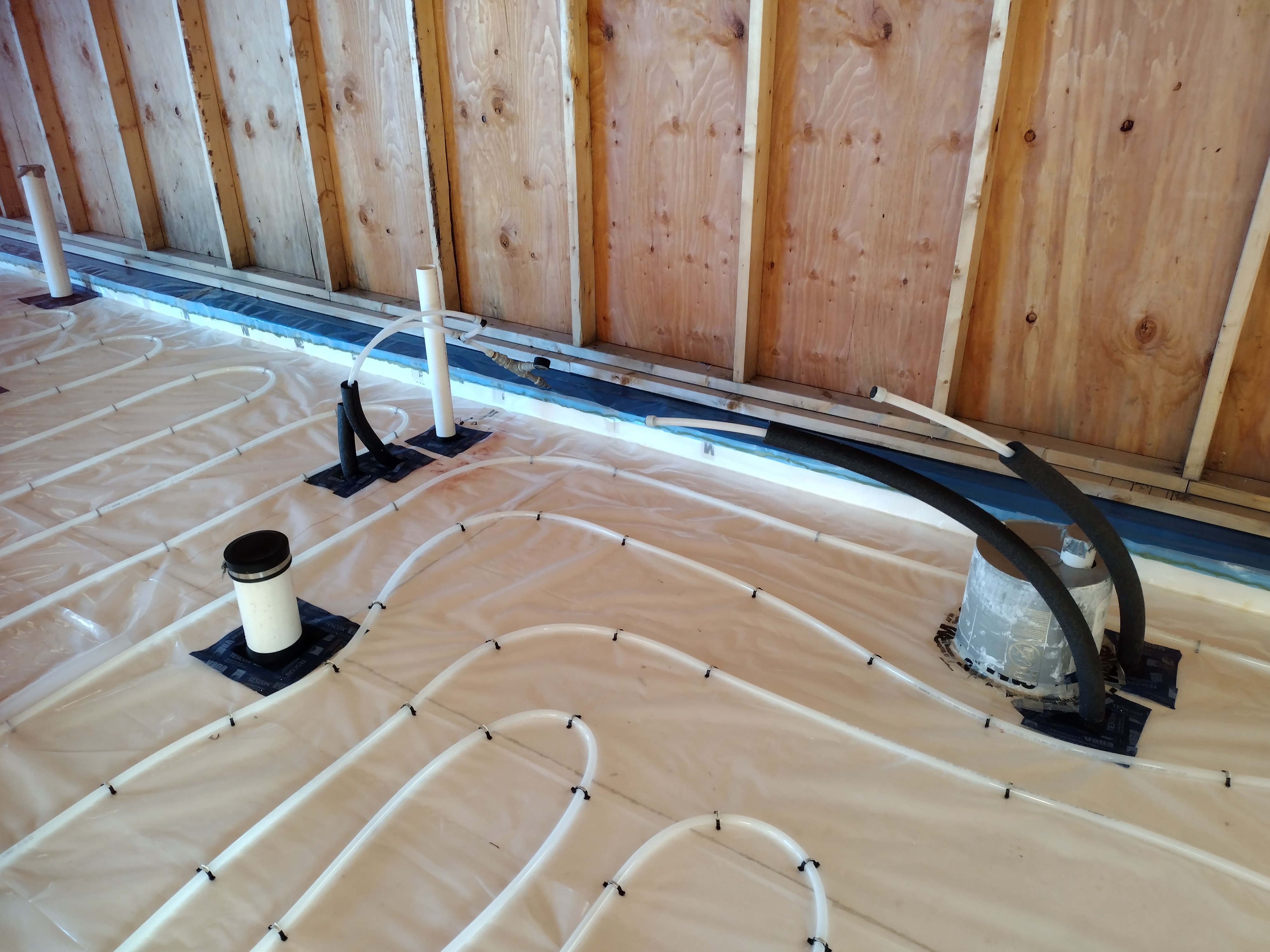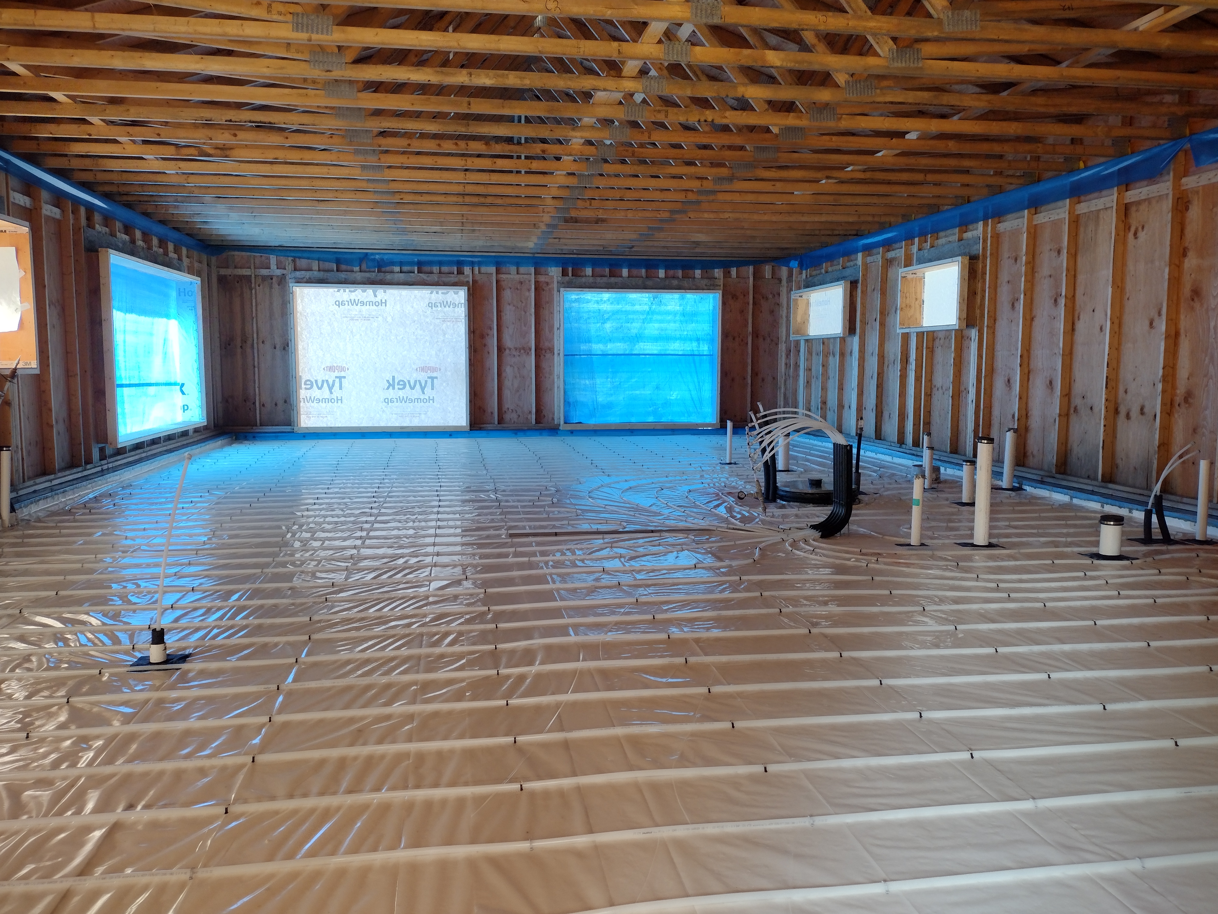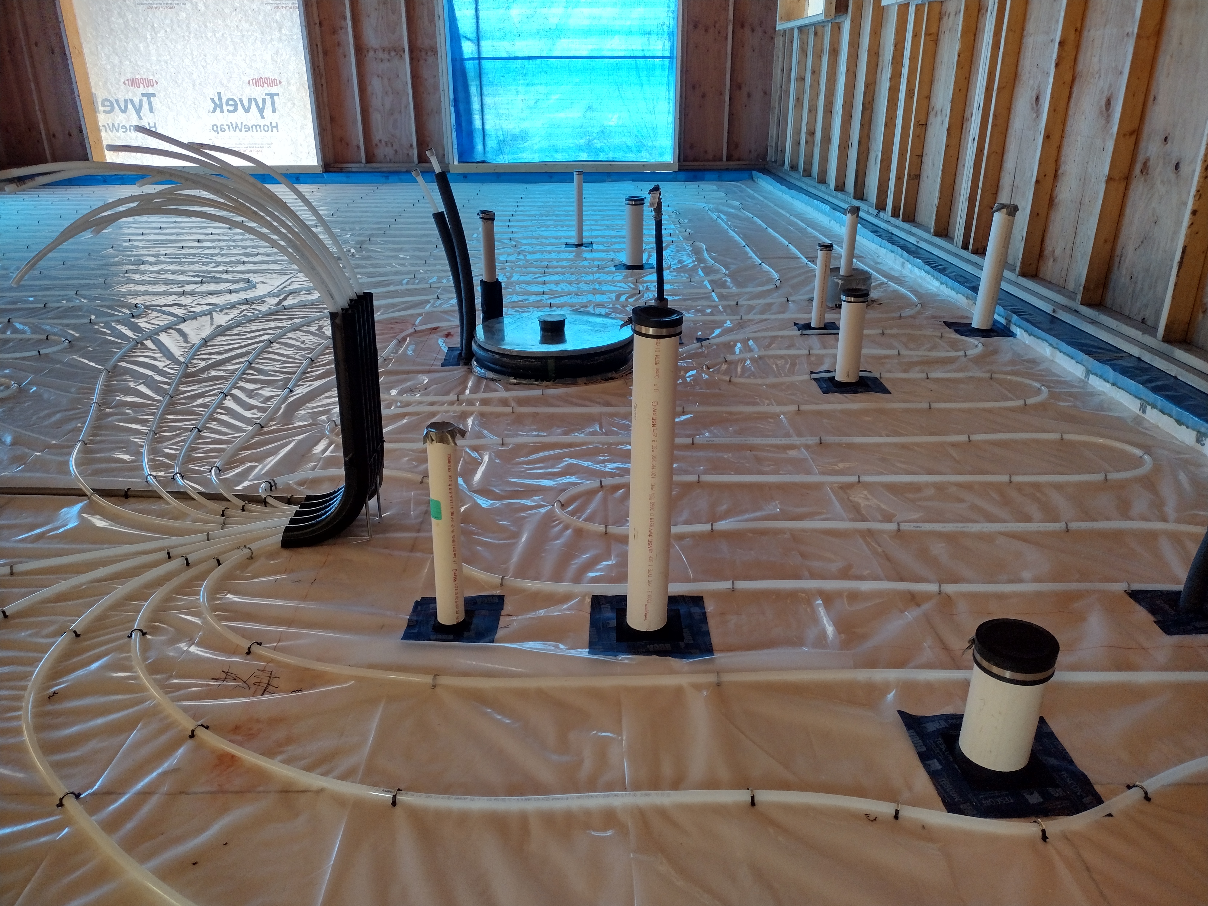 We lapped the polyethylene seams and air-sealed all the mechanical penetrations to it with snug fitting gaskets or tape. In this way, the poly acts as an air barrier (in conjunction with the slab) against radon gas. It also acts as an effective vapor barrier, even accounting for the numerous stab holes from the PEX staples. For a lively discussion on this topic see “Poly Under Concrete Slab” on the Green Building Advisor website.