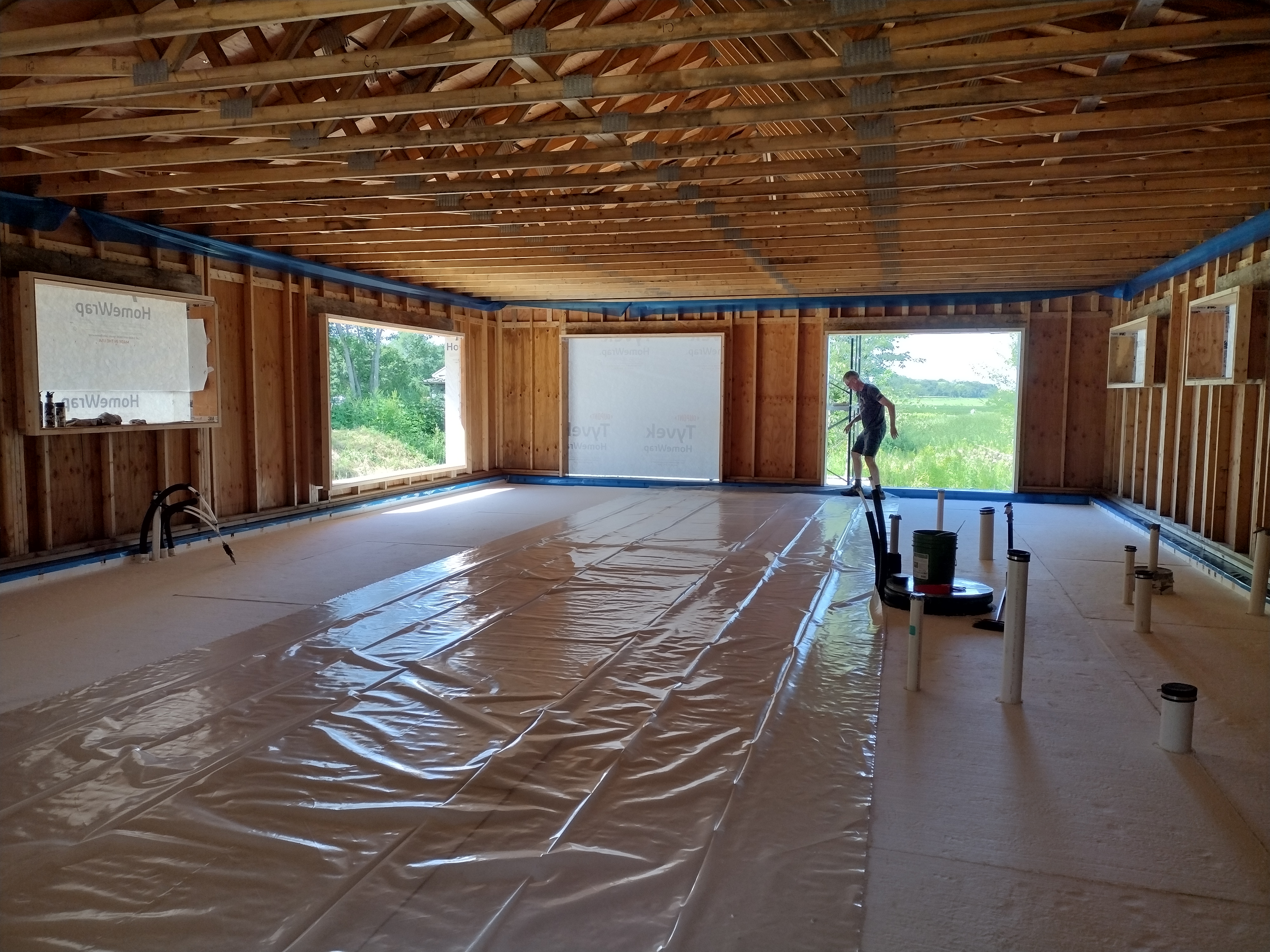 August 1 – August 30: As soon as the exterior of the house was buttoned up against the weather, our “weekend warrior” crew set to work prepping for the house and garage slab pours. We had a lot of steps ahead of us to create an air-sealed, vapor-sealed, and thermally-sealed assembly prior to the Big Day.