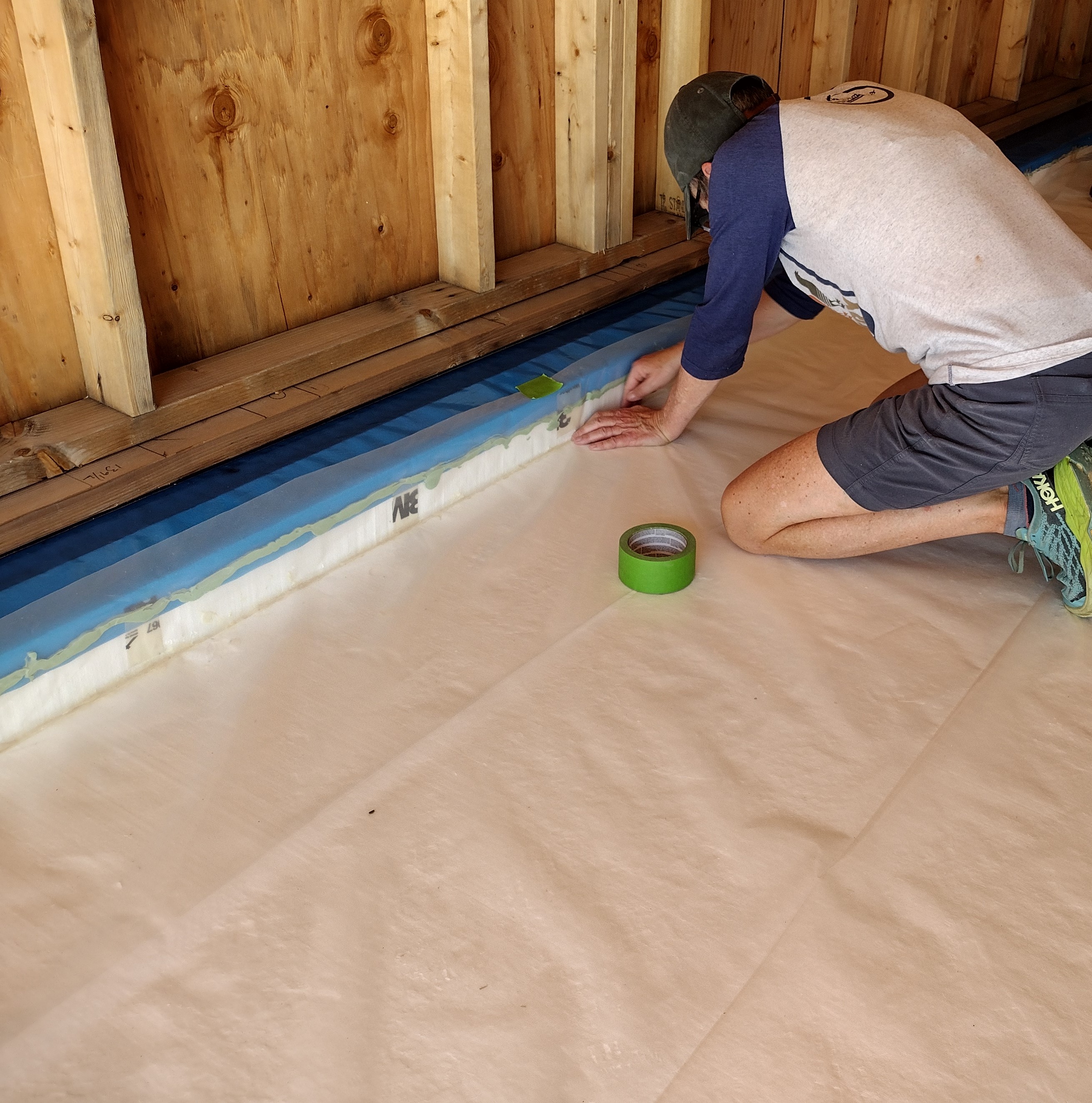 Our next step was to roll out 6 mil polyethylene vapor barrier and caulk or tape it to the previously installed strip of blue vapor barrier (see Sill Plates). Together with the taped plywood wall sheathing, this creates the home’s exterior air barrier (see Exterior Air + Water Barriers).