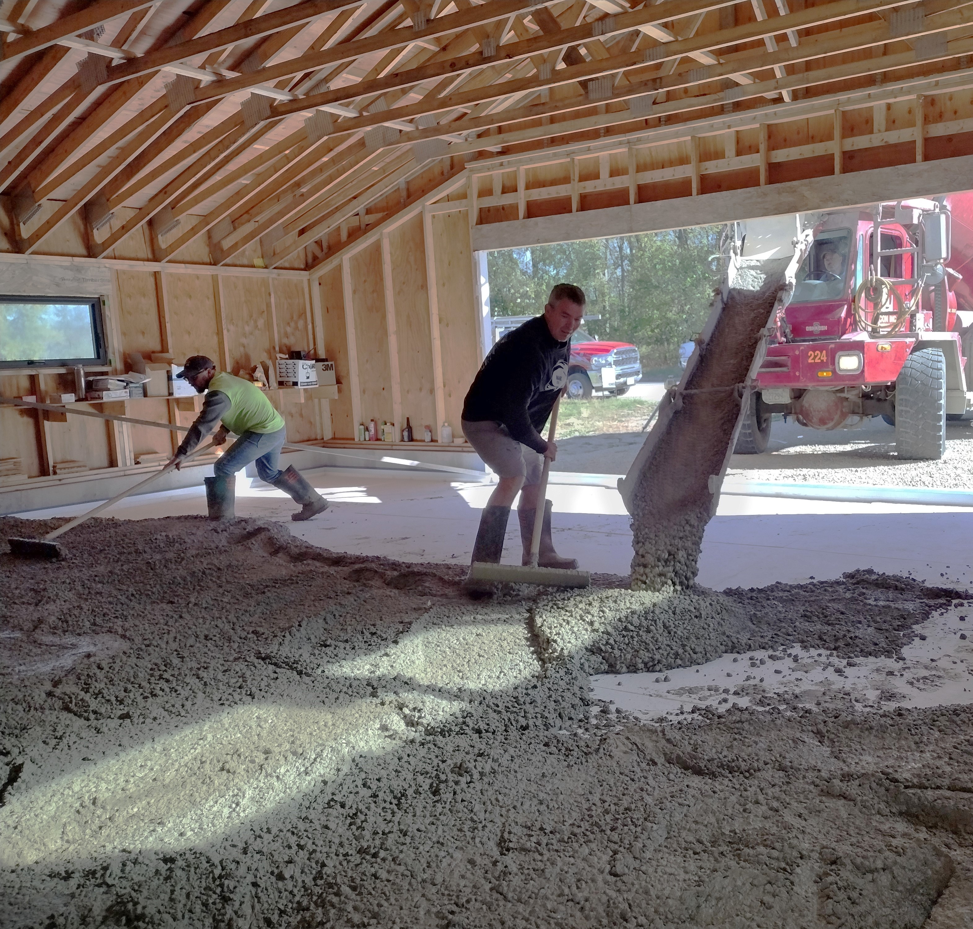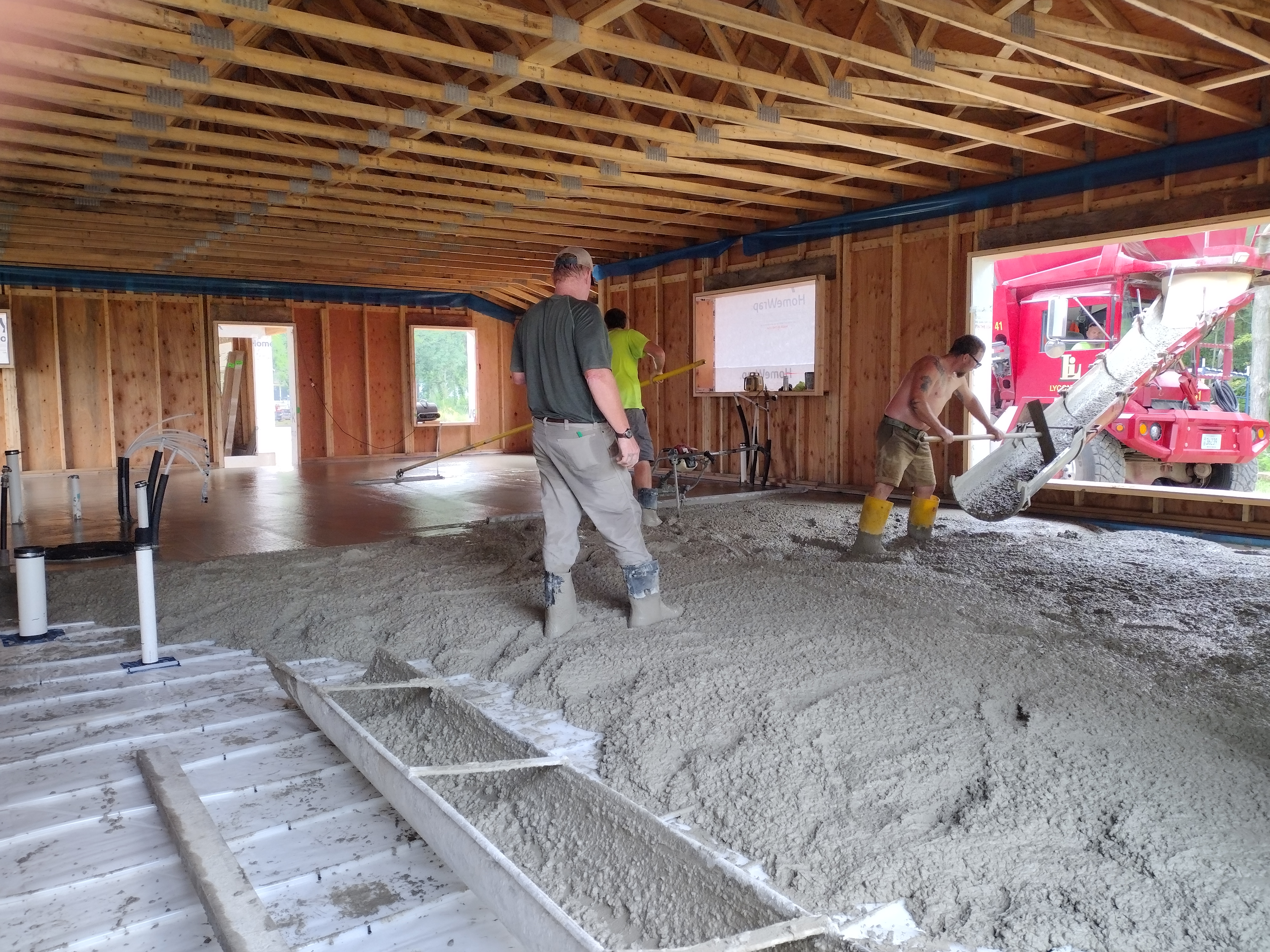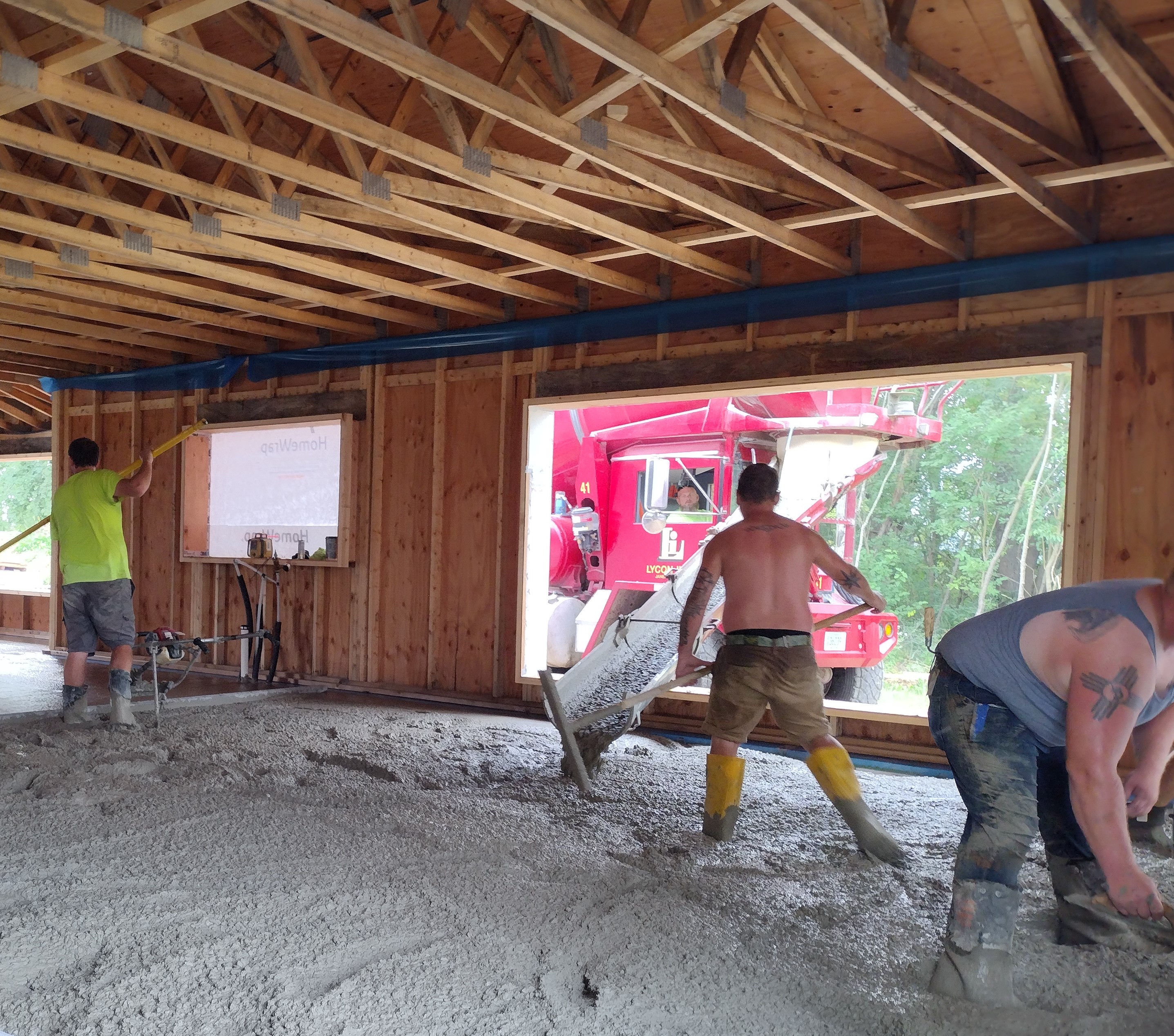 The big day! Here is the crew from Rockcrete in Ridgeway pouring our slab. While in the planning stages for this project, I was determined to get the walls and roof up and covered before we attempted the slab prep and pour. There are so many advantages: no need for tarping against the rain, no work stoppages due to inclement weather, no worries about the concrete curing too fast in the hot sun, and no sunburns!