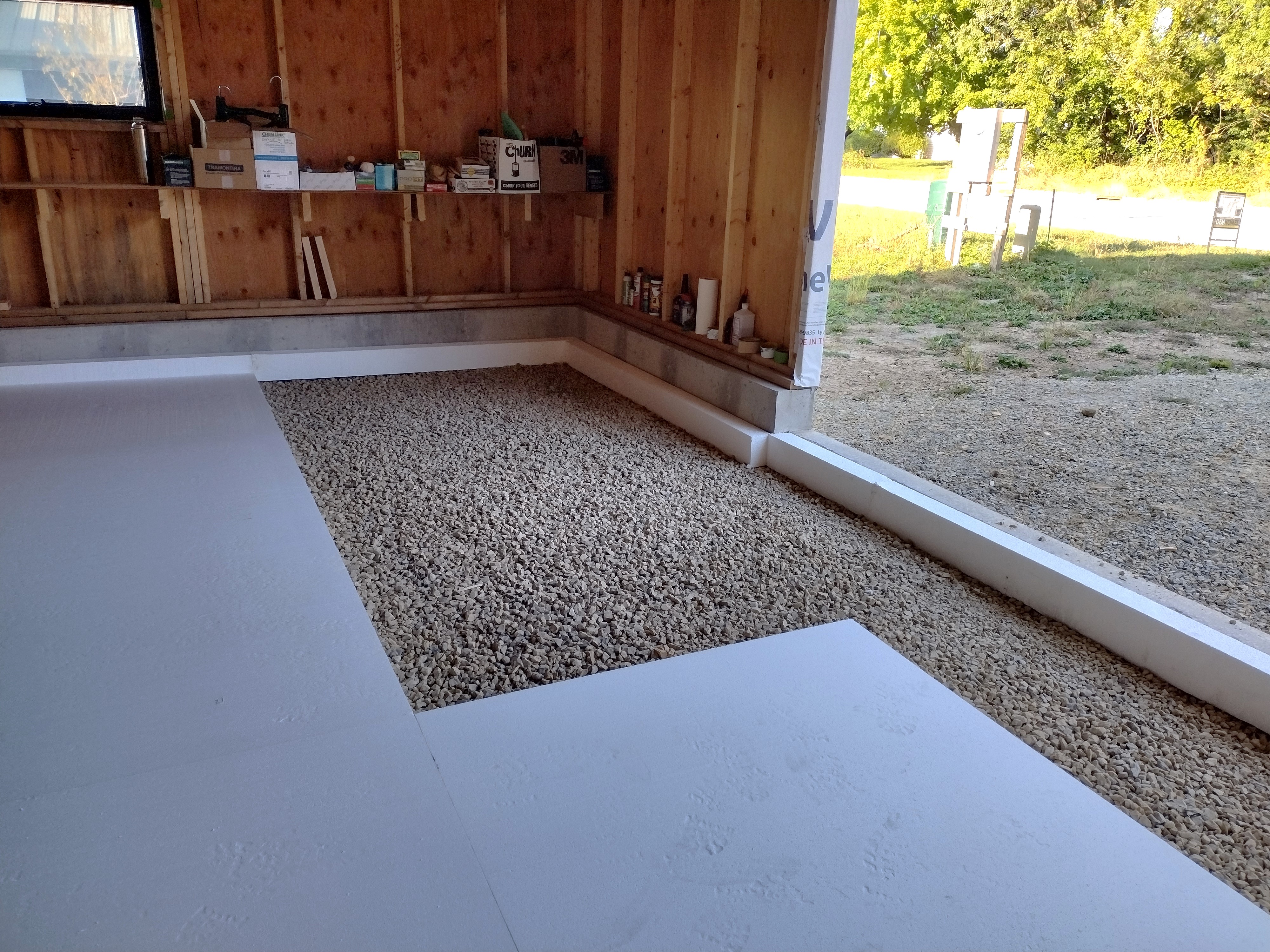 By October, I could pull away from other tasks and lay down the garage foam. I used the leftovers from the house foam for a 4 inch thick edge, which jogs to align with the overhead door, then laid down the 2 inch thick under-slab foam. Galvanized steel channels protect the top of the exposed edge. An insulated slab like this is unlikely to “sweat” in the spring, and will keep tools and supplies drier. A dedicated vapor barrier isn’t necessary here: the 2 inch foam is sufficient to slow upward vapor migration. Should a future owner decide to insulate the garage, they’ll be off to a good start.