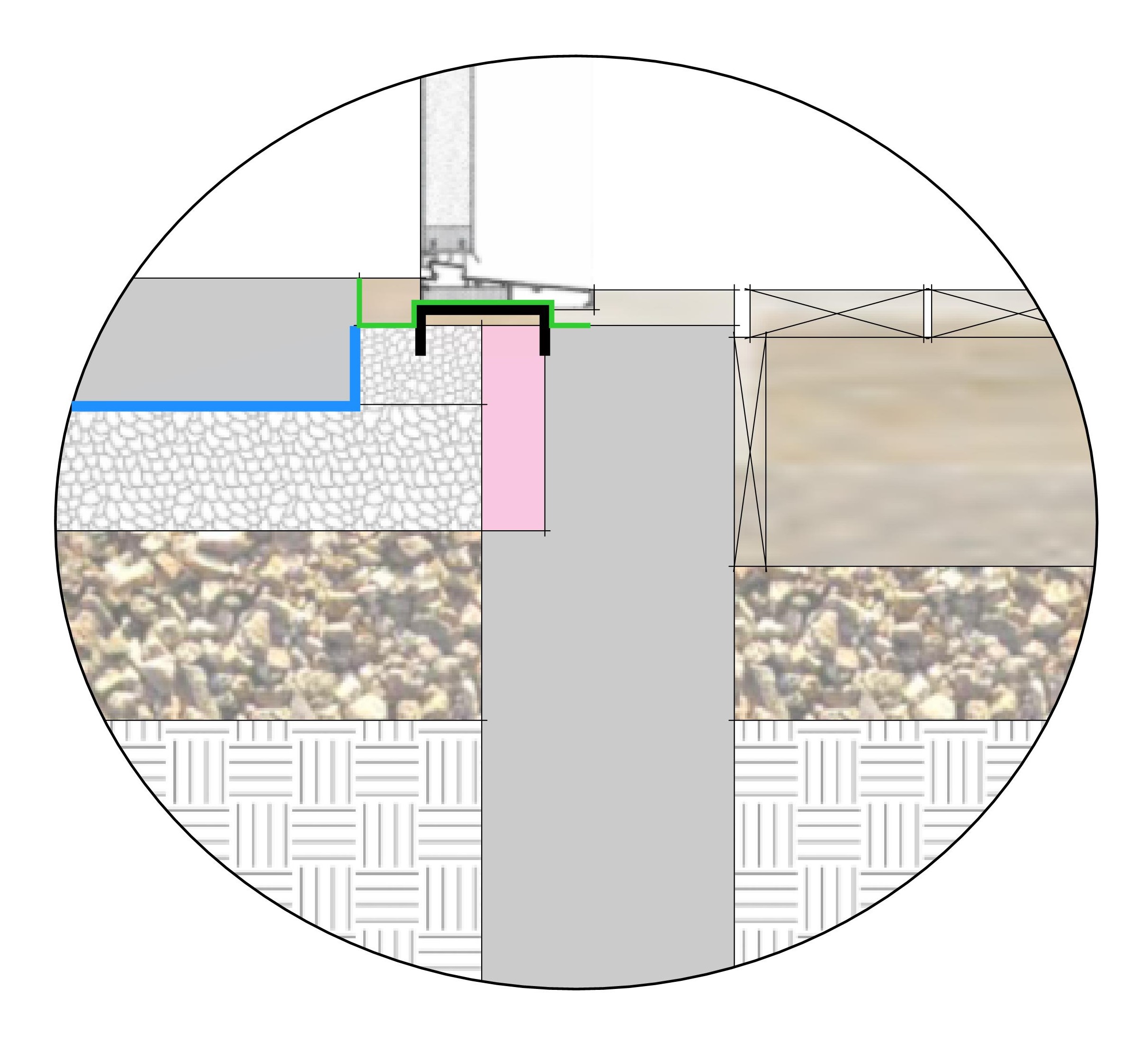 Here is a section drawing showing the front door sill assembly. The green line is the 3M tape paired with FlexWrap to create a waterproof layer over the galvanized steel channel and plywood strip. A deck board will be notched to slip under the door’s aluminum sill to provide support.