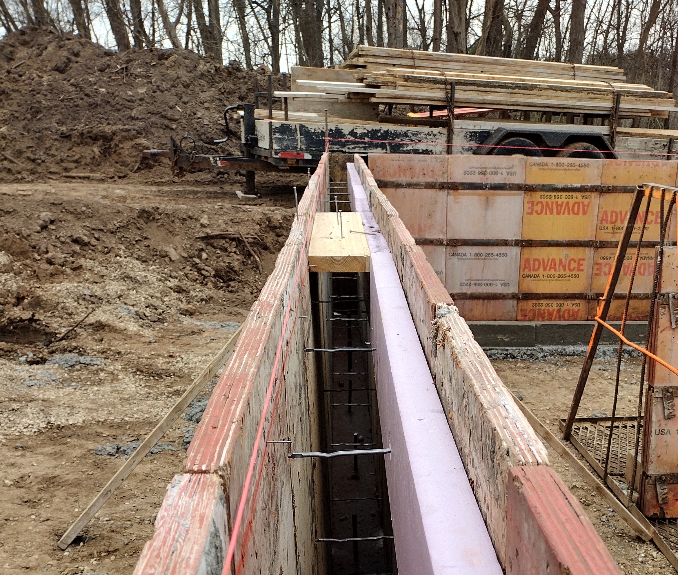 The front door presented its own unique challenge. It was important to me that we have an accessible entryway. Typical residential doors come with a bulky sill that can usually be overcome with sloped extensions or by building up interior floor layers, but with our slab floor we’re more locked in. For my last project, I chose an aluminum ADA sill which provides a low threshold but no effective thermal break: it frosts up during cold snaps. For this project, I had the concrete contractor block out the doorway with a 2×6, so that the top of the frostwall would land 1-1/2″ below the slab.