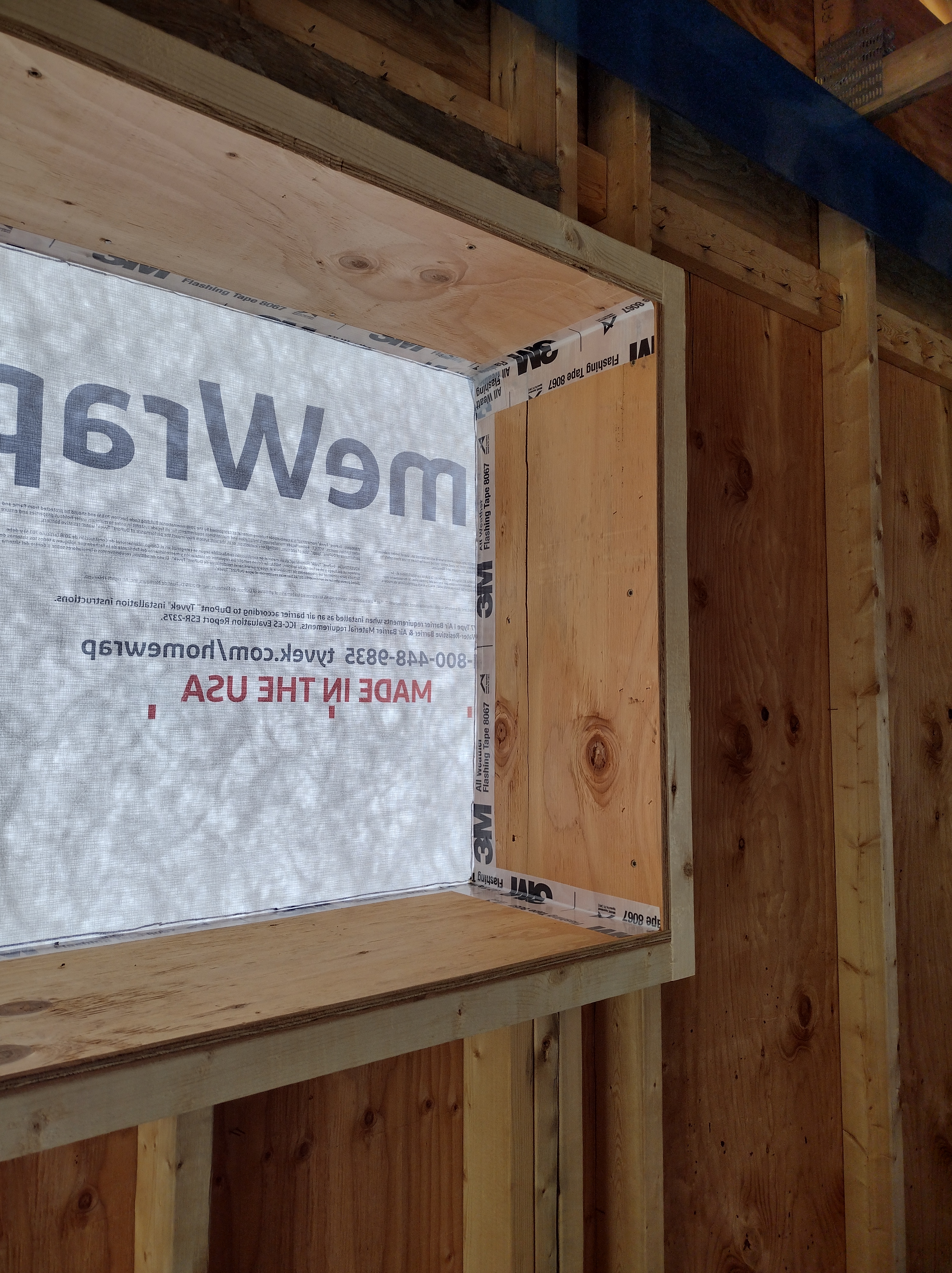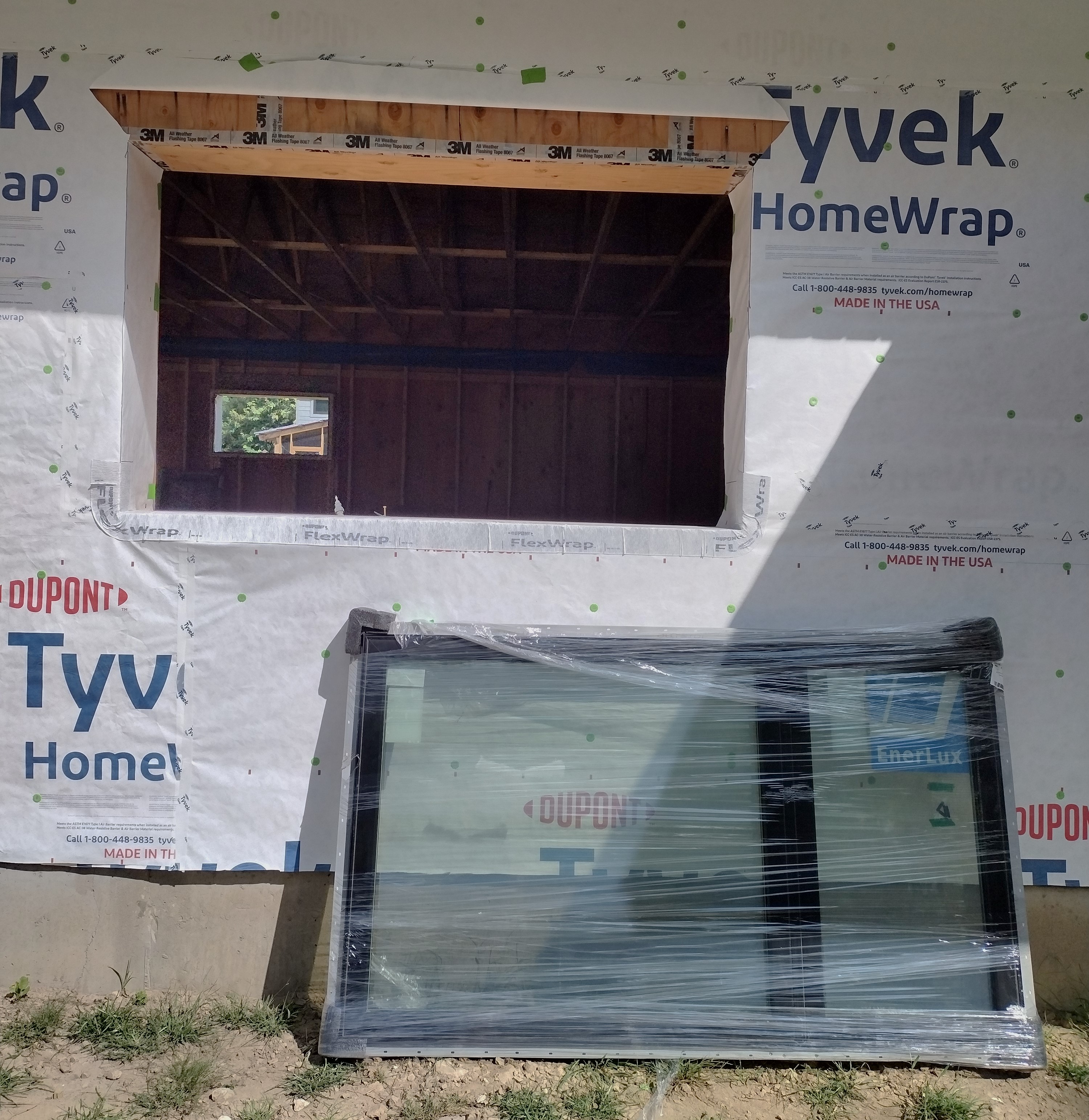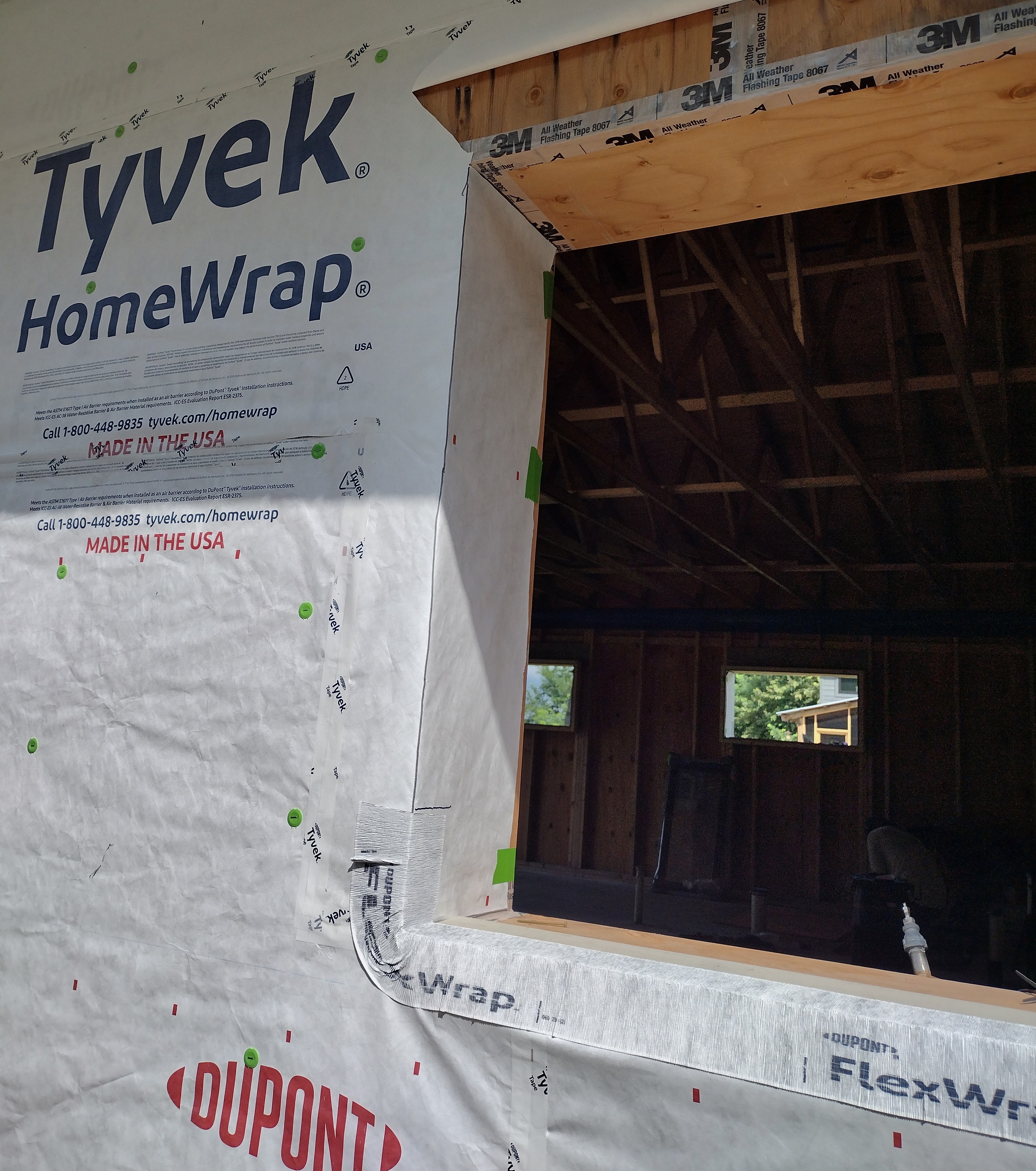 With the Tyvek temporarily turned up at the top, and the FlexWrap providing a waterproof barrier at the sill, the carpenters popped in the windows “level, plumb, and square”.