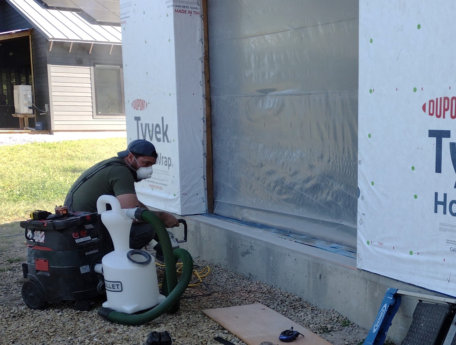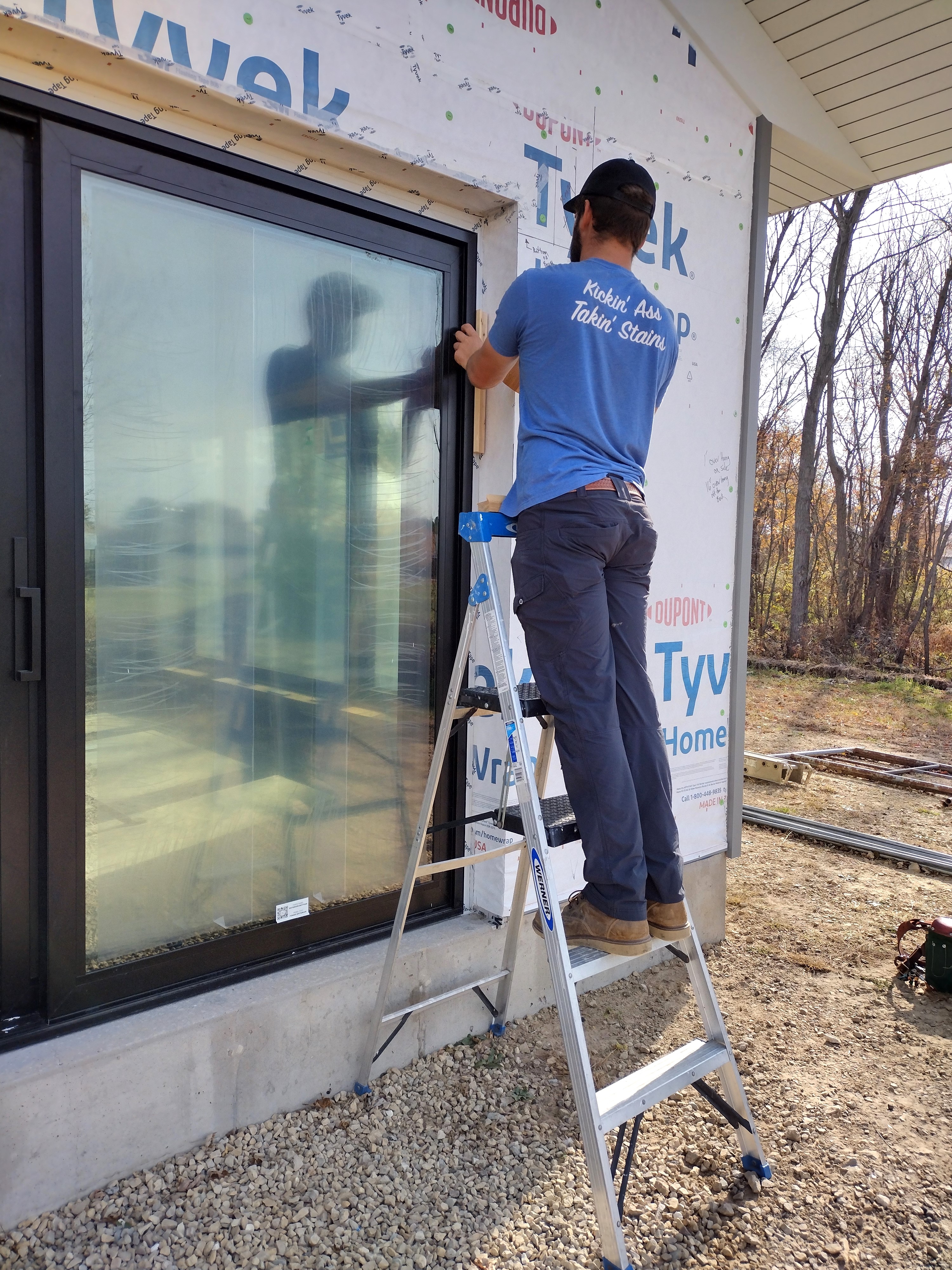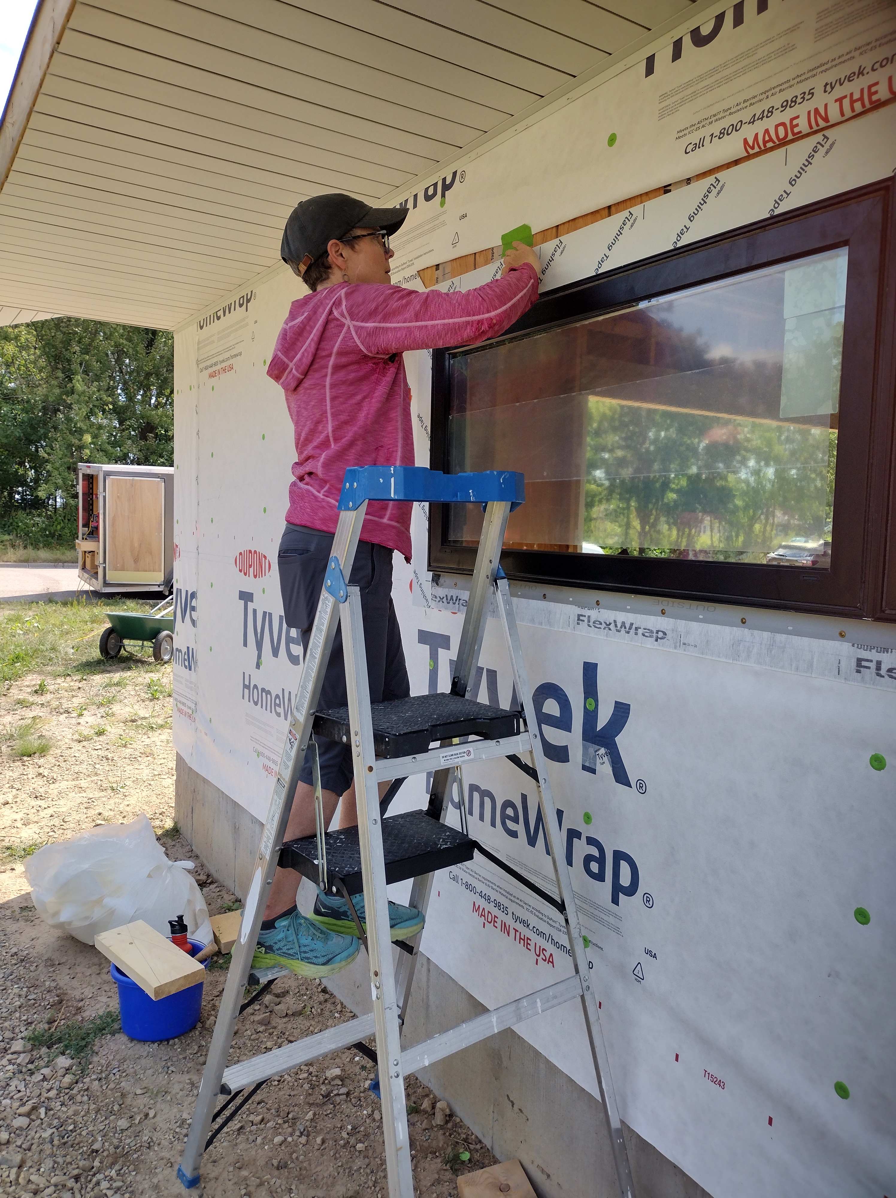 With the Tyvek temporarily turned up at the top, and the FlexWrap providing a waterproof barrier at the sill, the carpenters popped in the windows “level, plumb, and square”.