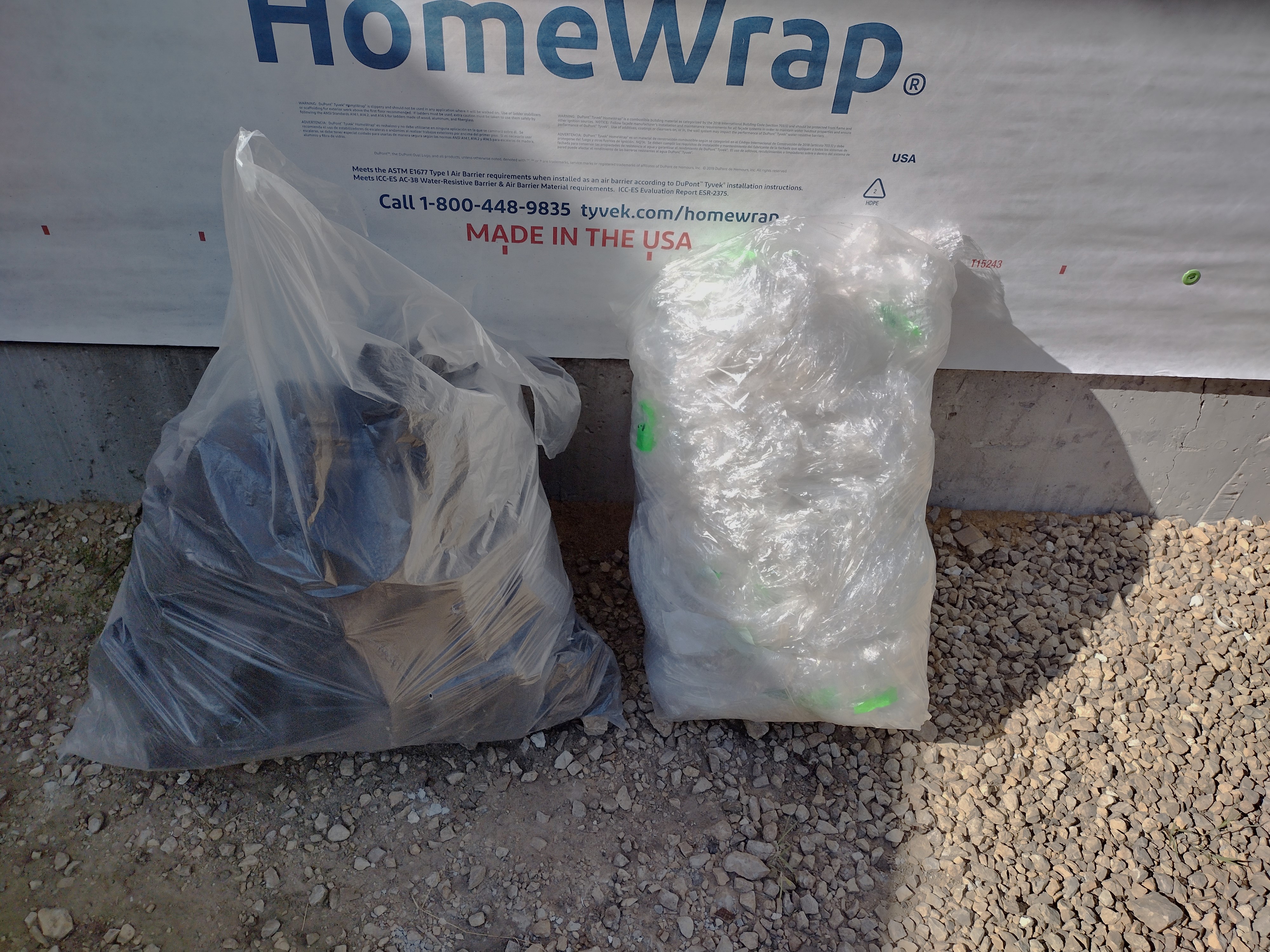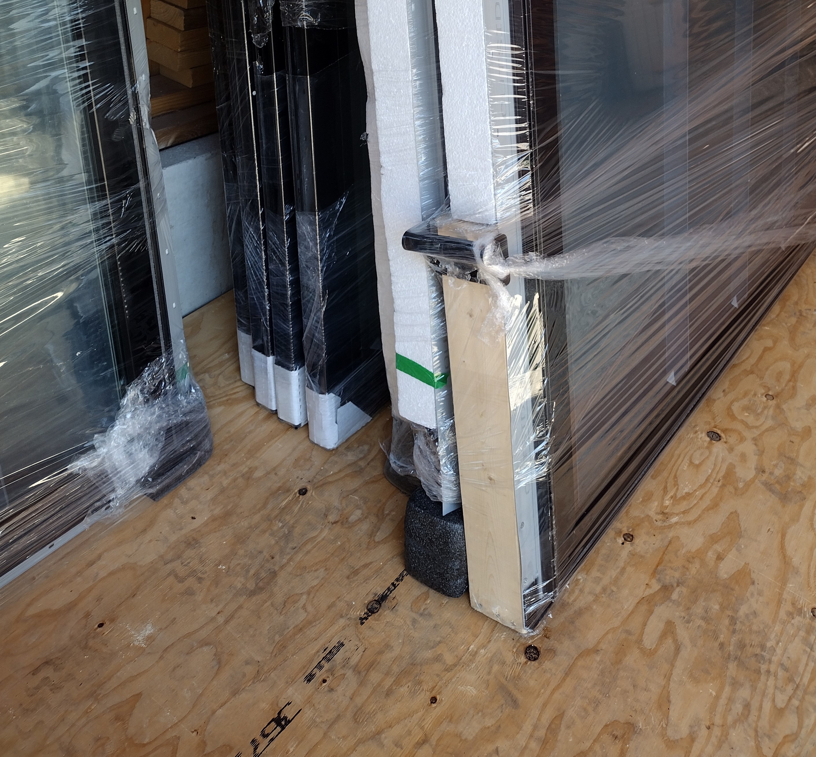 This phase of work generated very little trash. The paper backing from the various tapes used is recyclable as miscellaneous paper. The clear plastic shrink wrap is also recyclable. There wasn’t much cardboard used in the packaging, but each bit was separated out and recycled. Many of the window and door corners came protected with black foam corners, and the heavier units came with black handles. These were coveted by Mike who could use them in his shop when shipping out his cabinetry work.