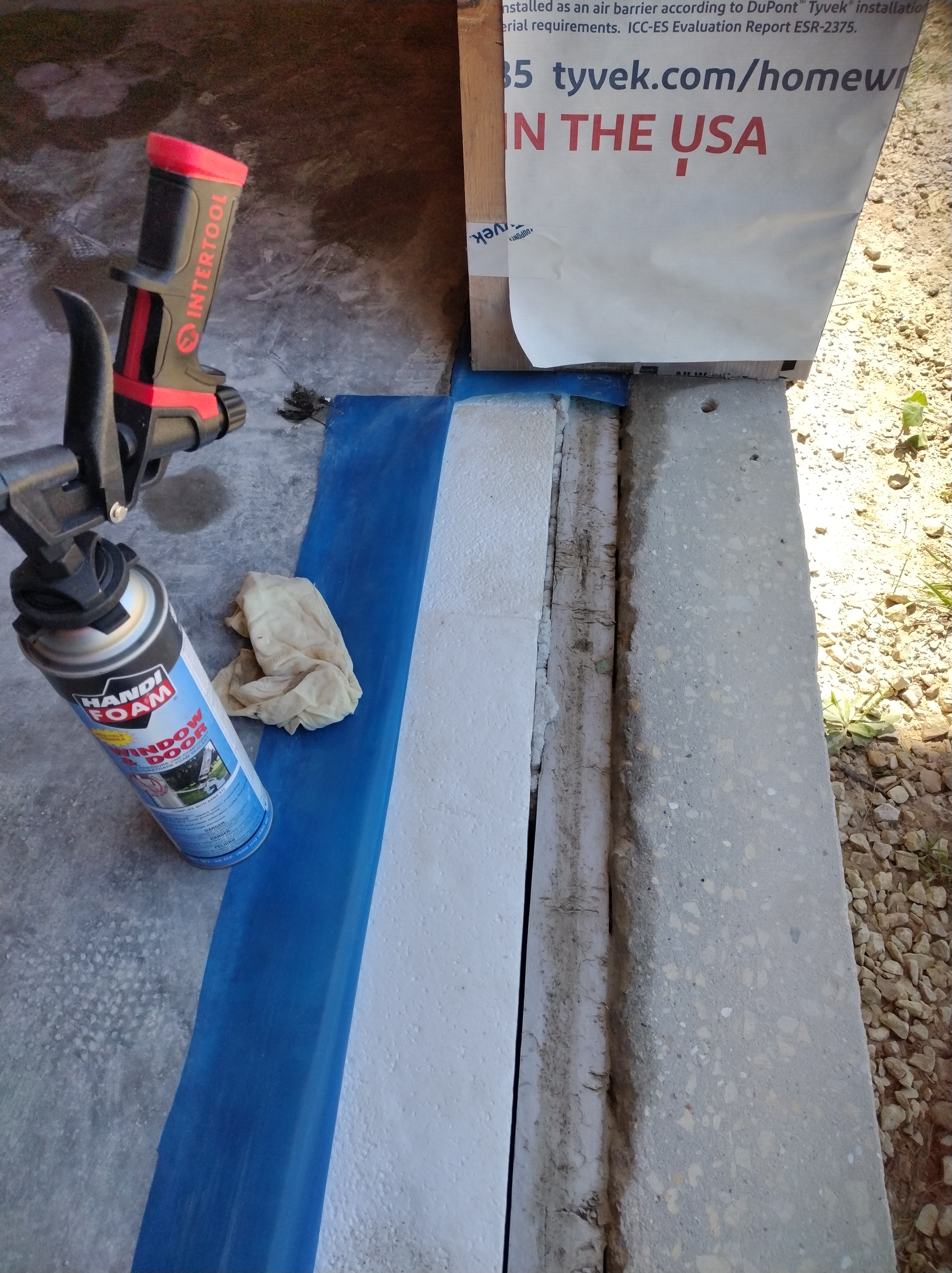 Next, I made sure the slab-edge foam was tight to the foundation wall and spray foamed any gaps. I glued the under-slab vapor barrier (blue) to the EPS foam (white). The carpenters glued down a length of beveled cedar siding to create a rot-resistant sill with positive drainage to the exterior. For an extra barrier to the entry of air and water, I taped the joints with 3M’s 8967 waterproof tape.