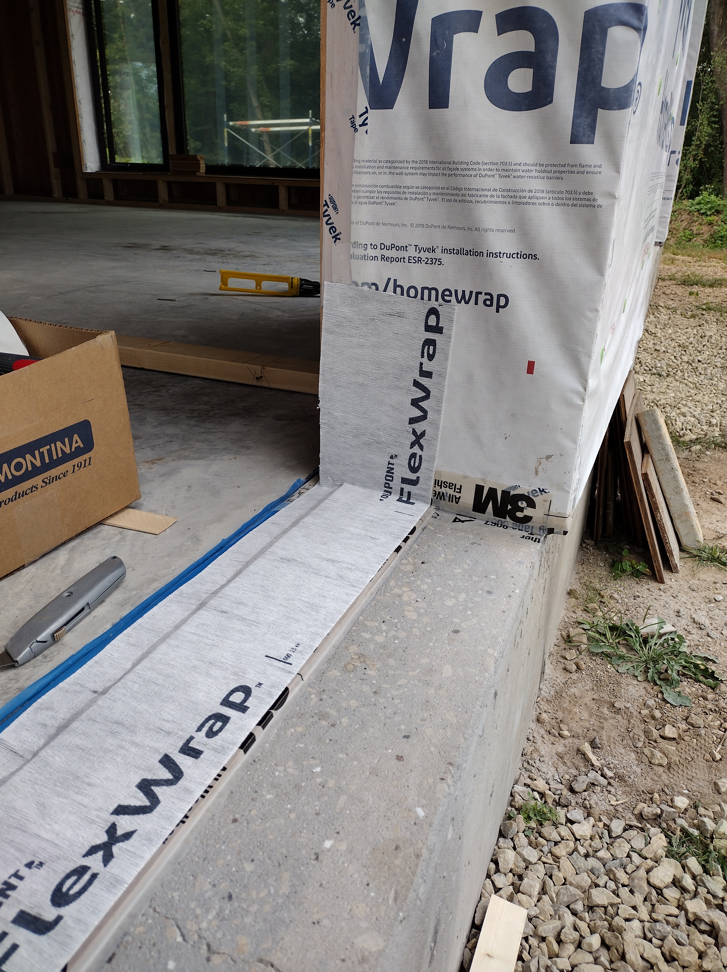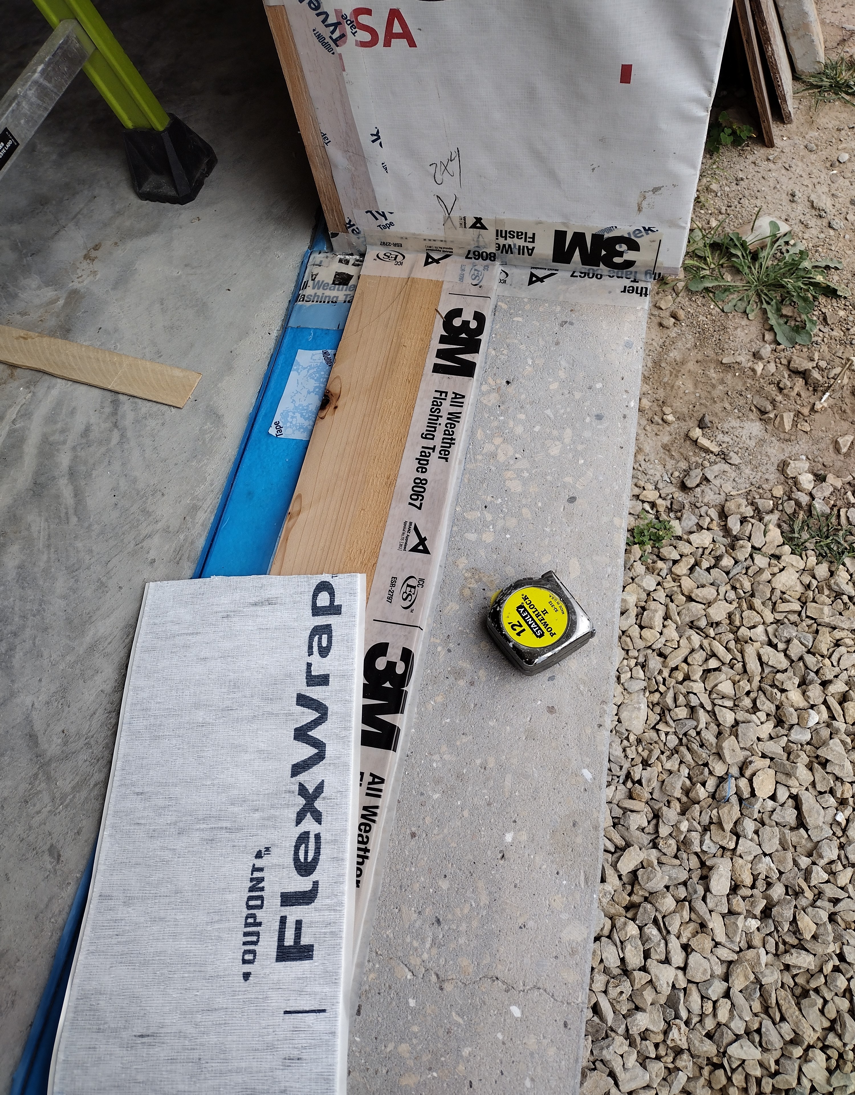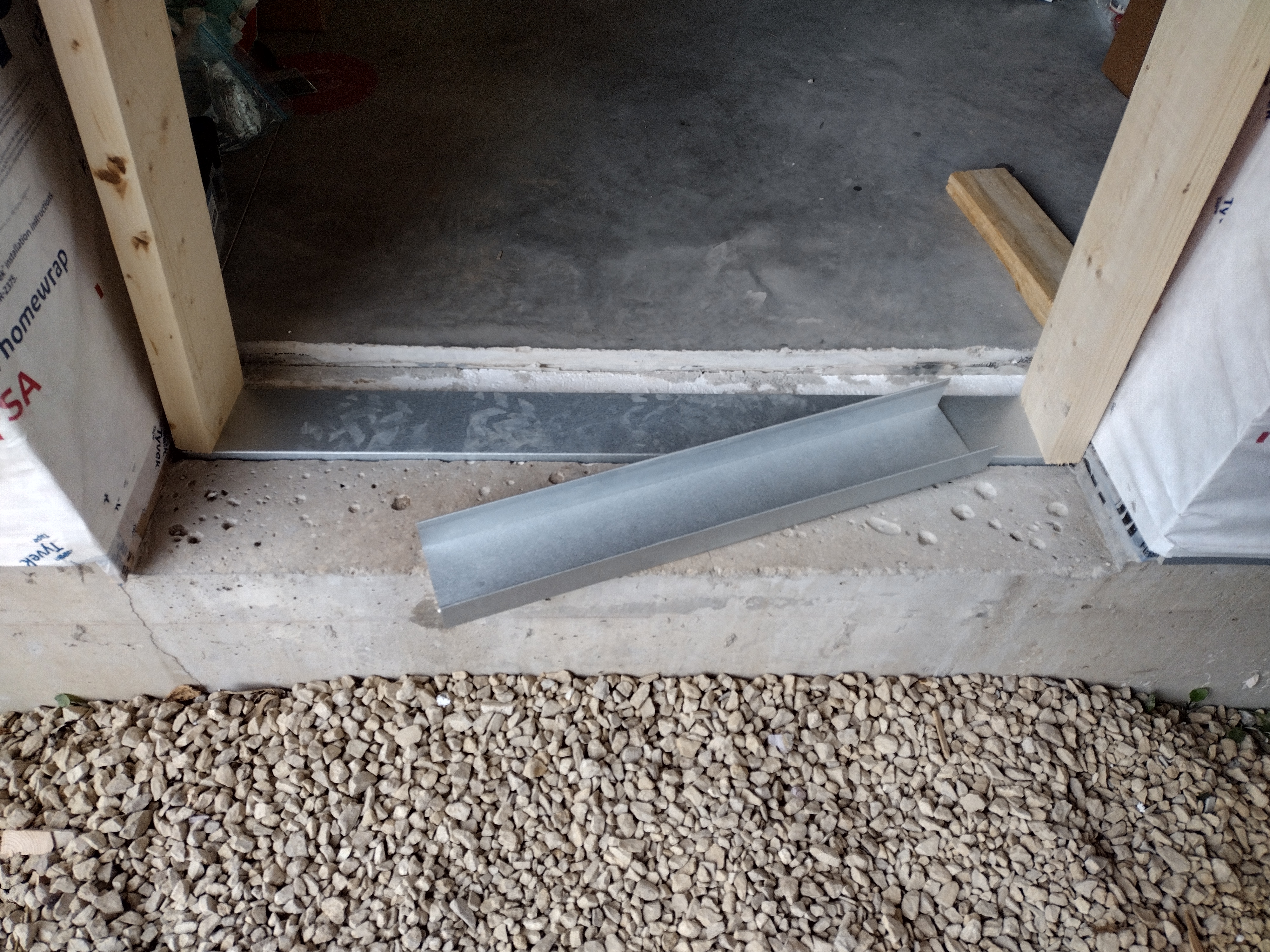 The carpenters secured a piece of plywood and a section of galvanized steel channel over the foam to provide a solid base for the door sill, adjusting it to the exact height needed to flush out with the slab. I caulked and taped and FlexWrapped as before.