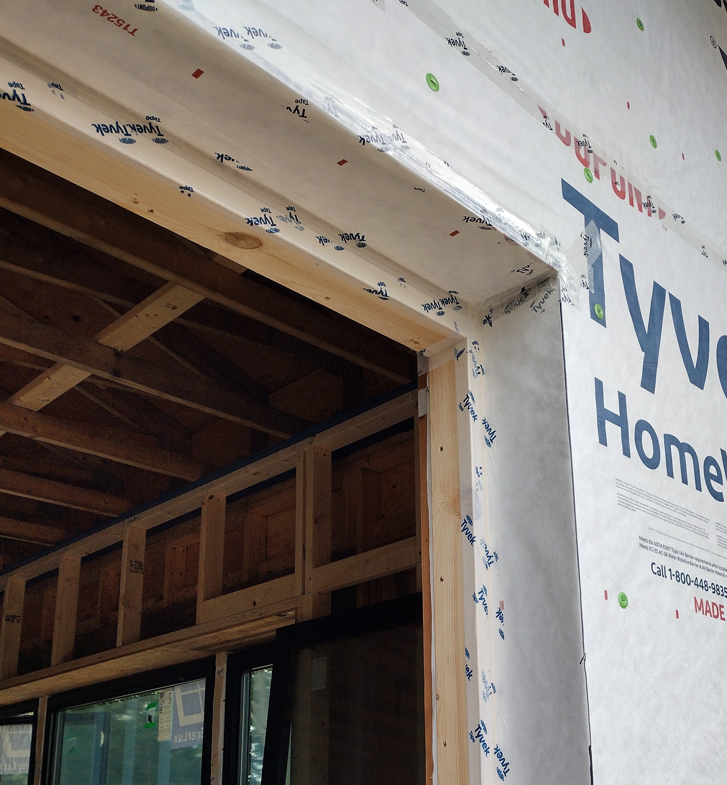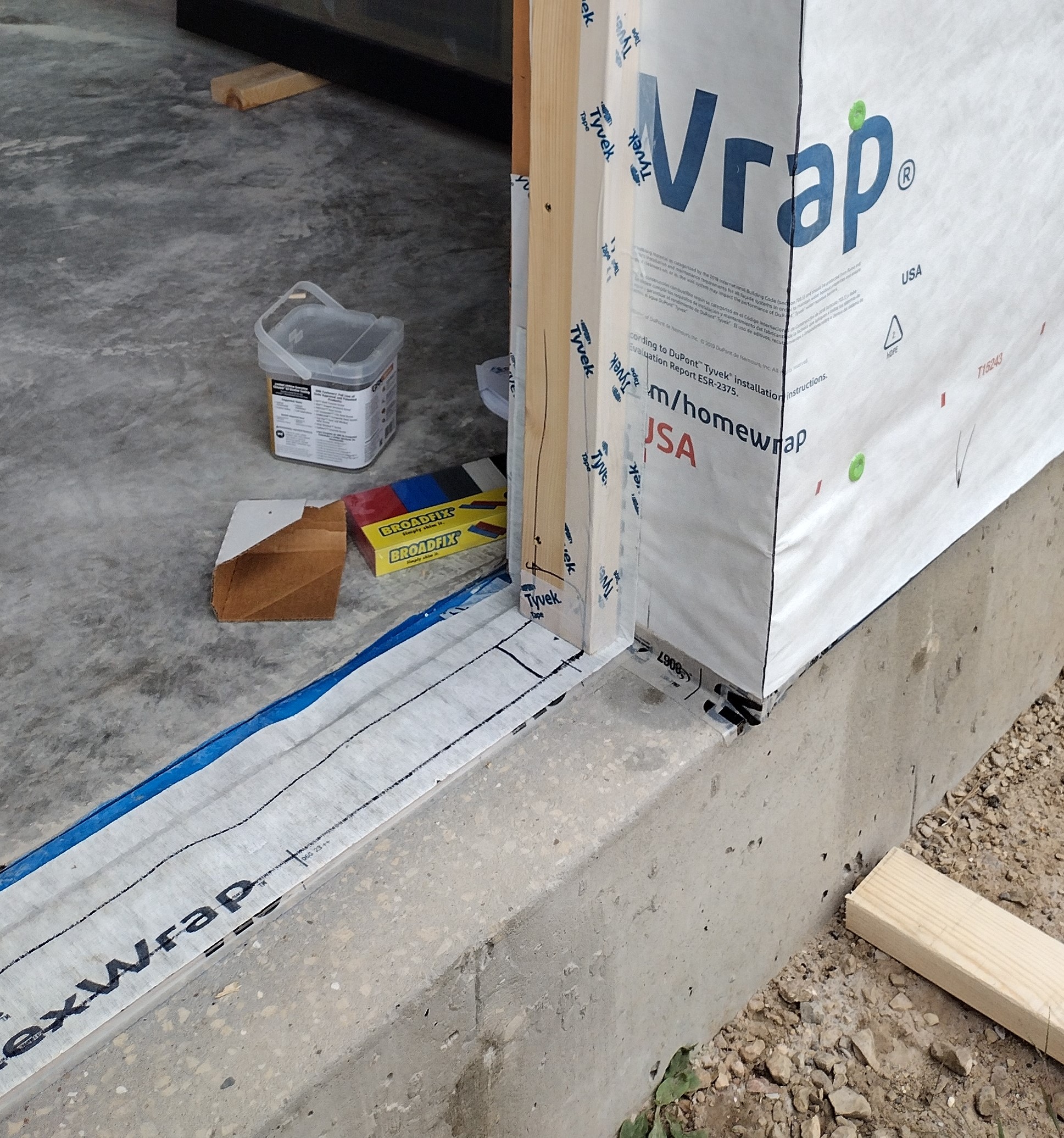 FlexWrap is a waterproof, flexible, and formable peel-and-stick membrane that’s easy to work with. A generous upturn at the jambs provides extra insurance at the corners, where most window and door installations fail. Next, 2x side and top jambs were ripped and nailed in place to align with the outer 4 inches of slab-edge foam. Tyvek tape seals the connection between wood and housewrap.