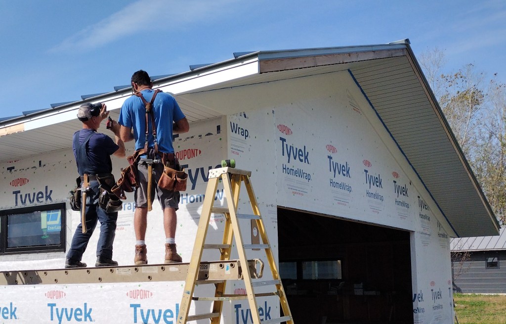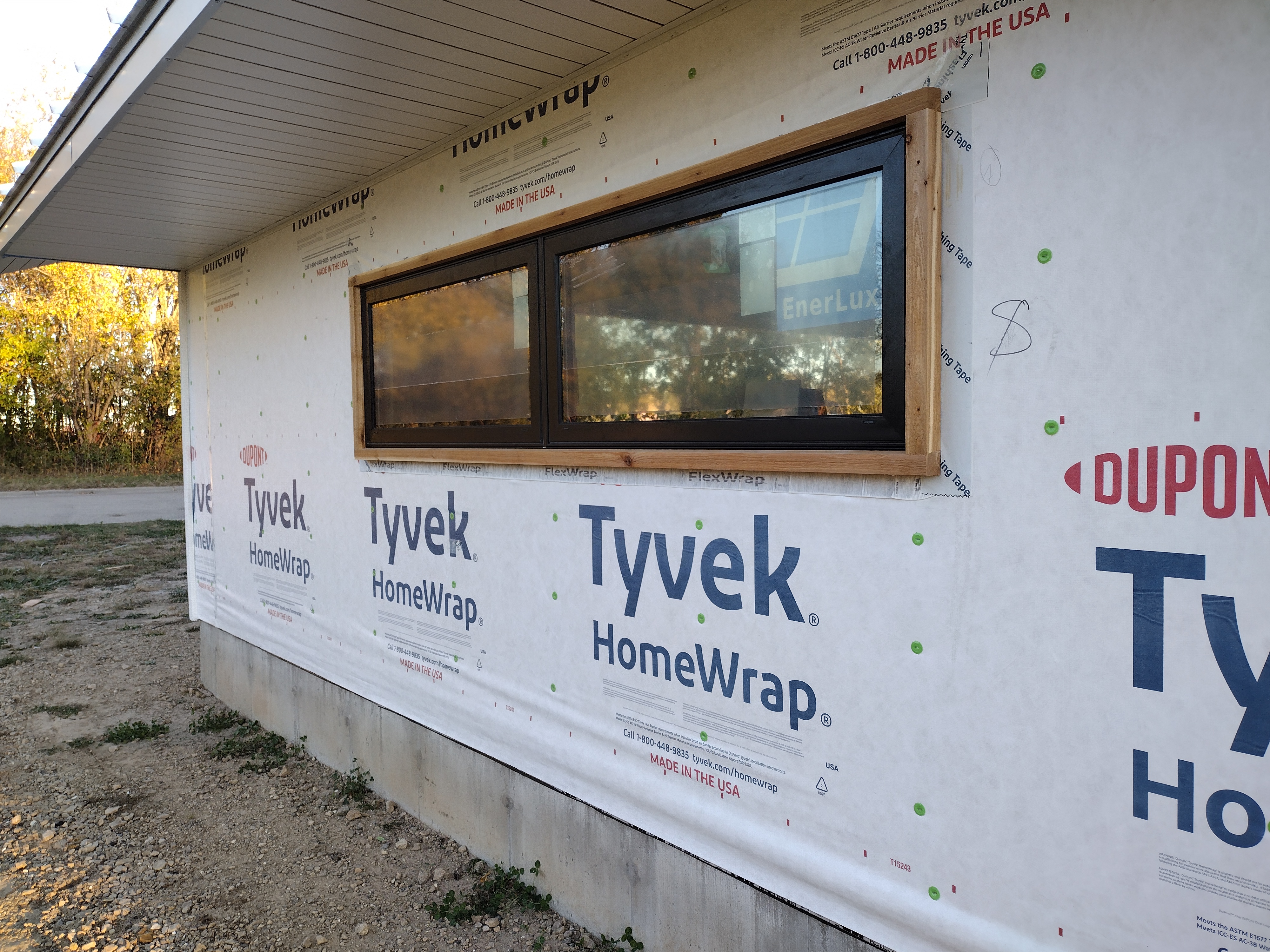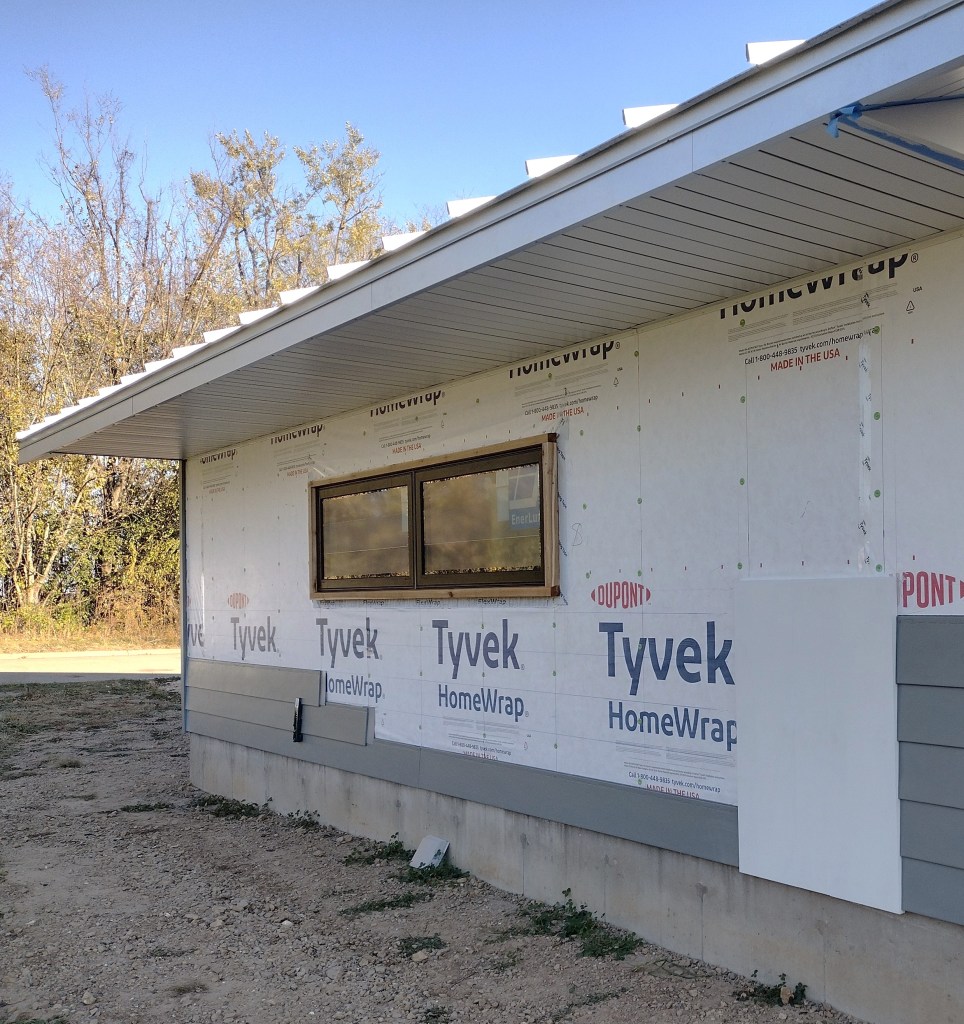 Because the walls of this house are only one story, and are well protected by 36 inch overhangs and rakes, I feel confident using conventional Tyvek. Additionally, the plank siding inherently creates triangular “drying” gaps behind each row. Our meticulous attention to air- and water-tightness on the exterior, and air- and vapor-tightness on the interior serve to keep the walls dry and free of mold, mildew, rot, and insect intrusion.