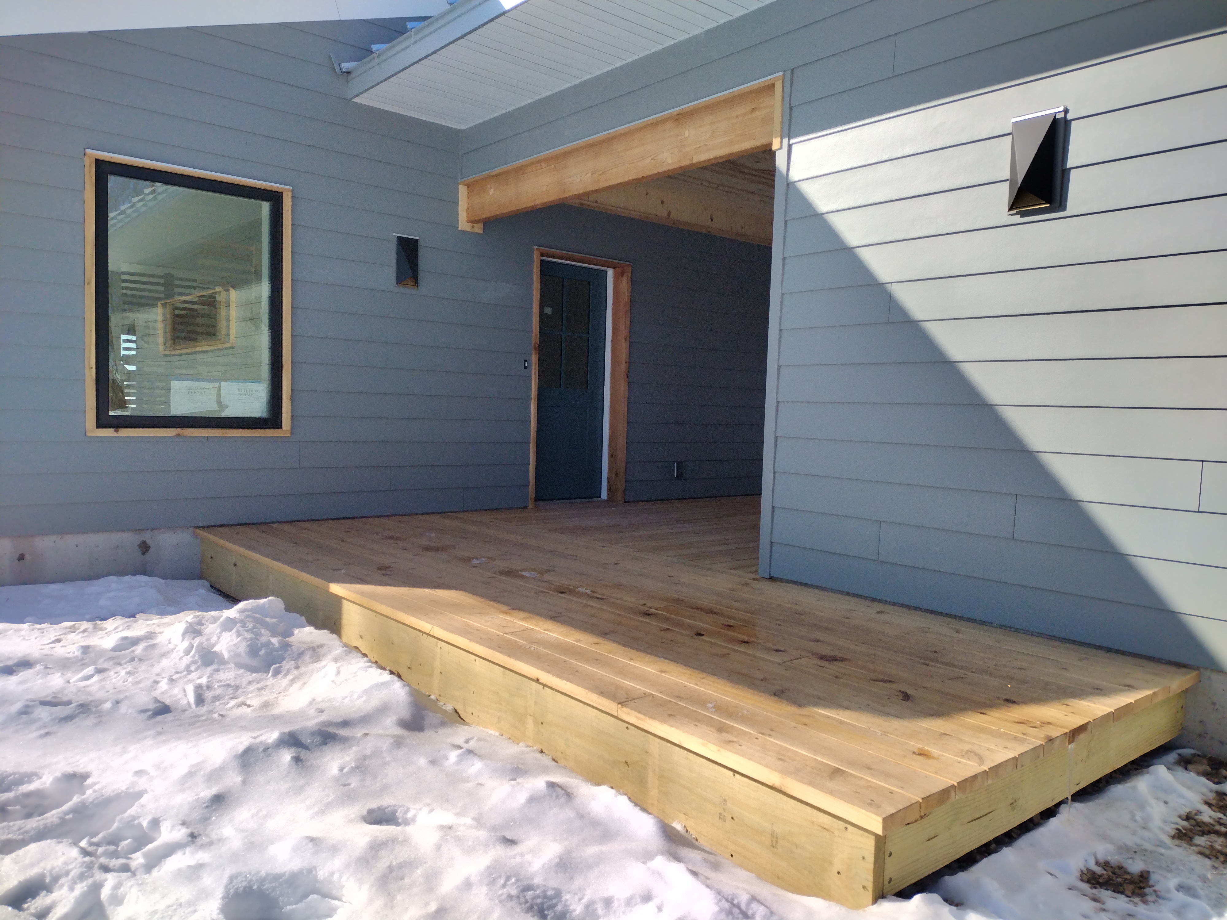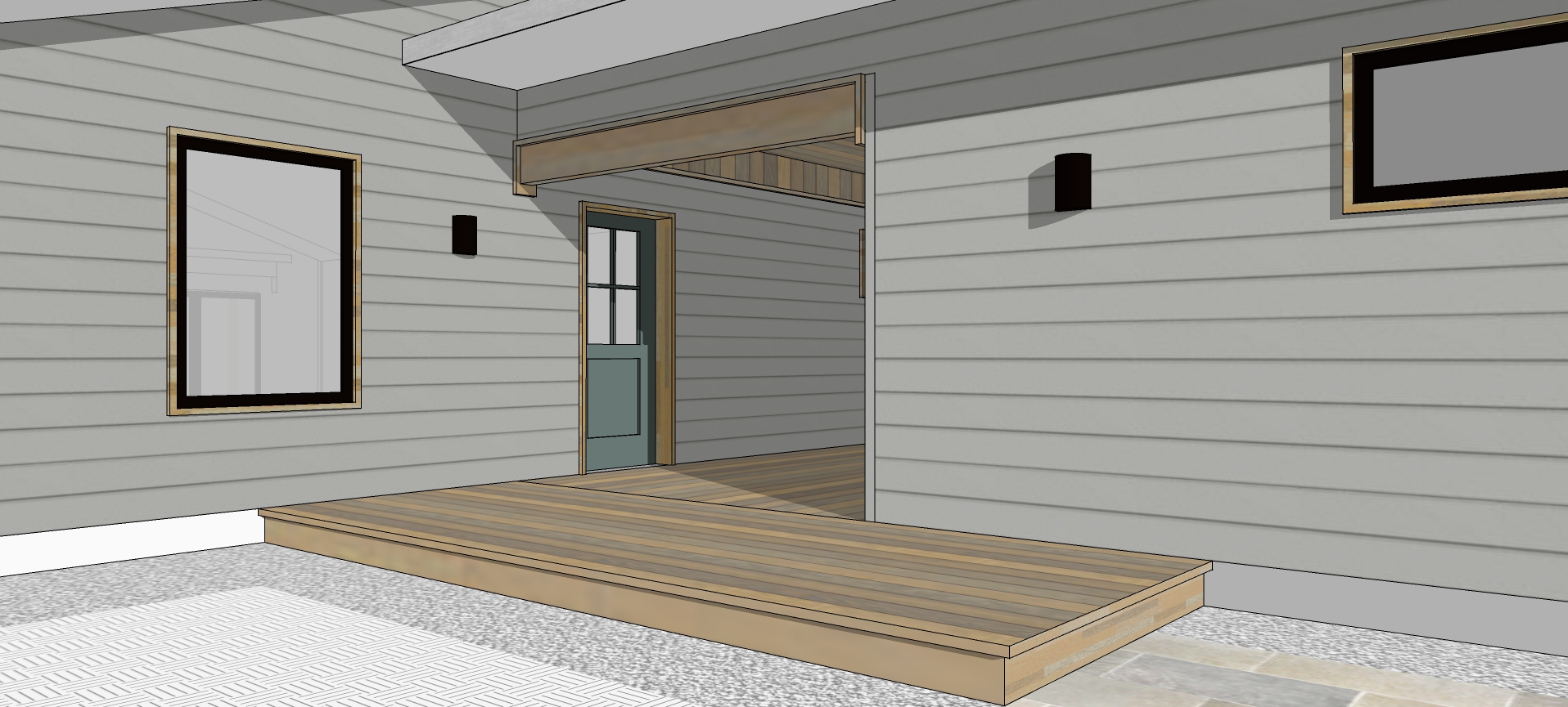It’s rewarding to see my design from a year ago finally built (drawing on right). The breezeway turned out beautifully, and features 2×6 cedar decking and a pine shiplap ceiling. The front door is of fiberglass construction from Therma-Tru, with a factory painted finish in the same hue as the siding, but darker.
