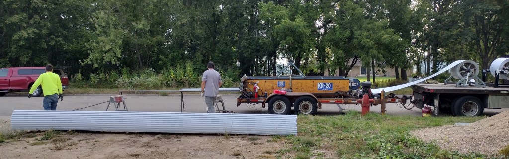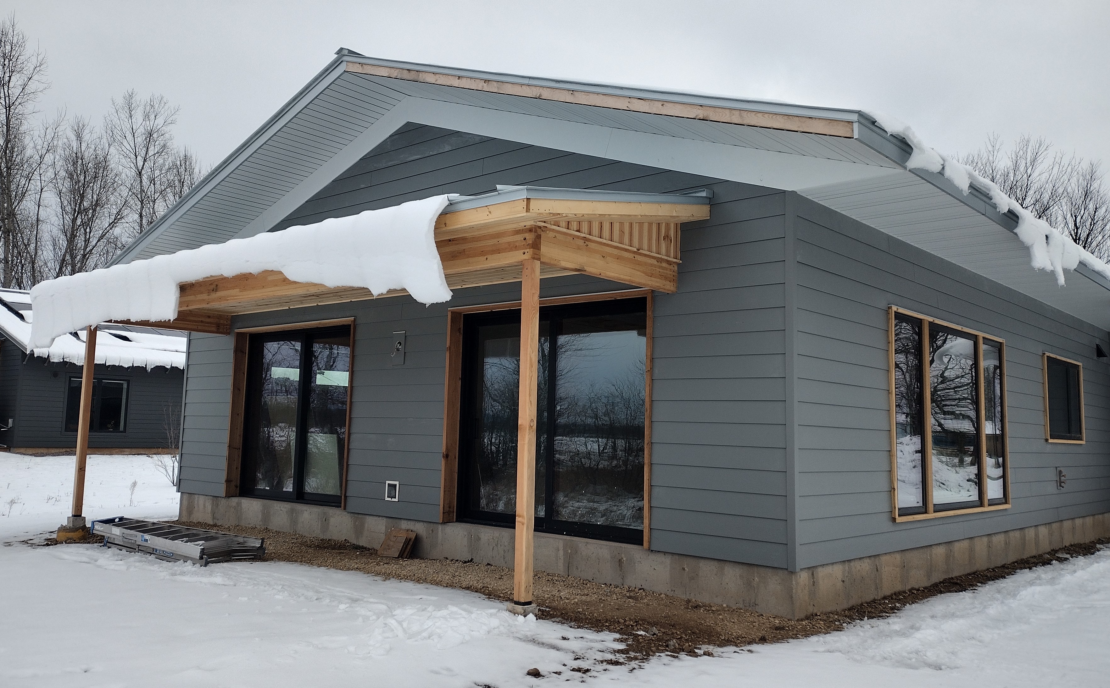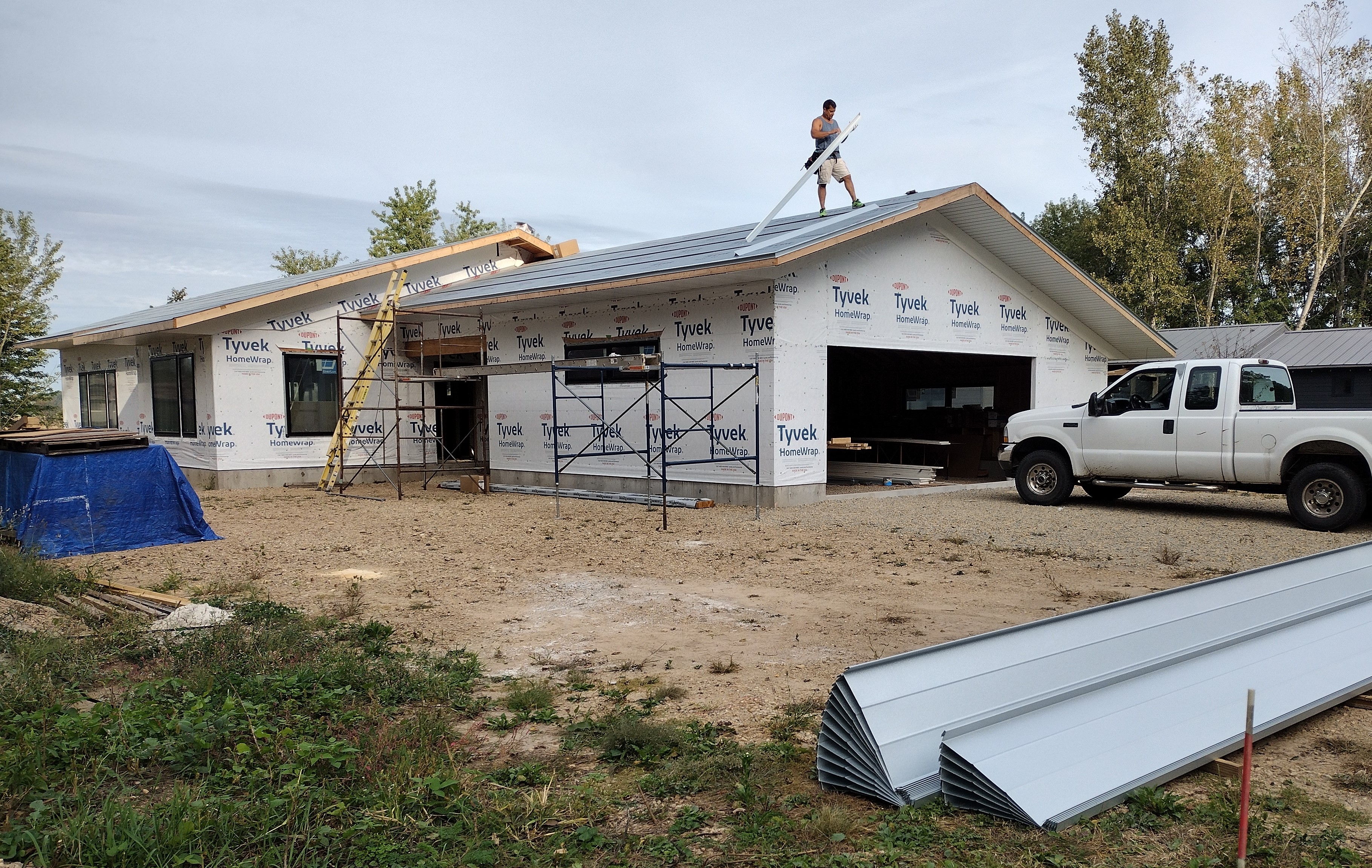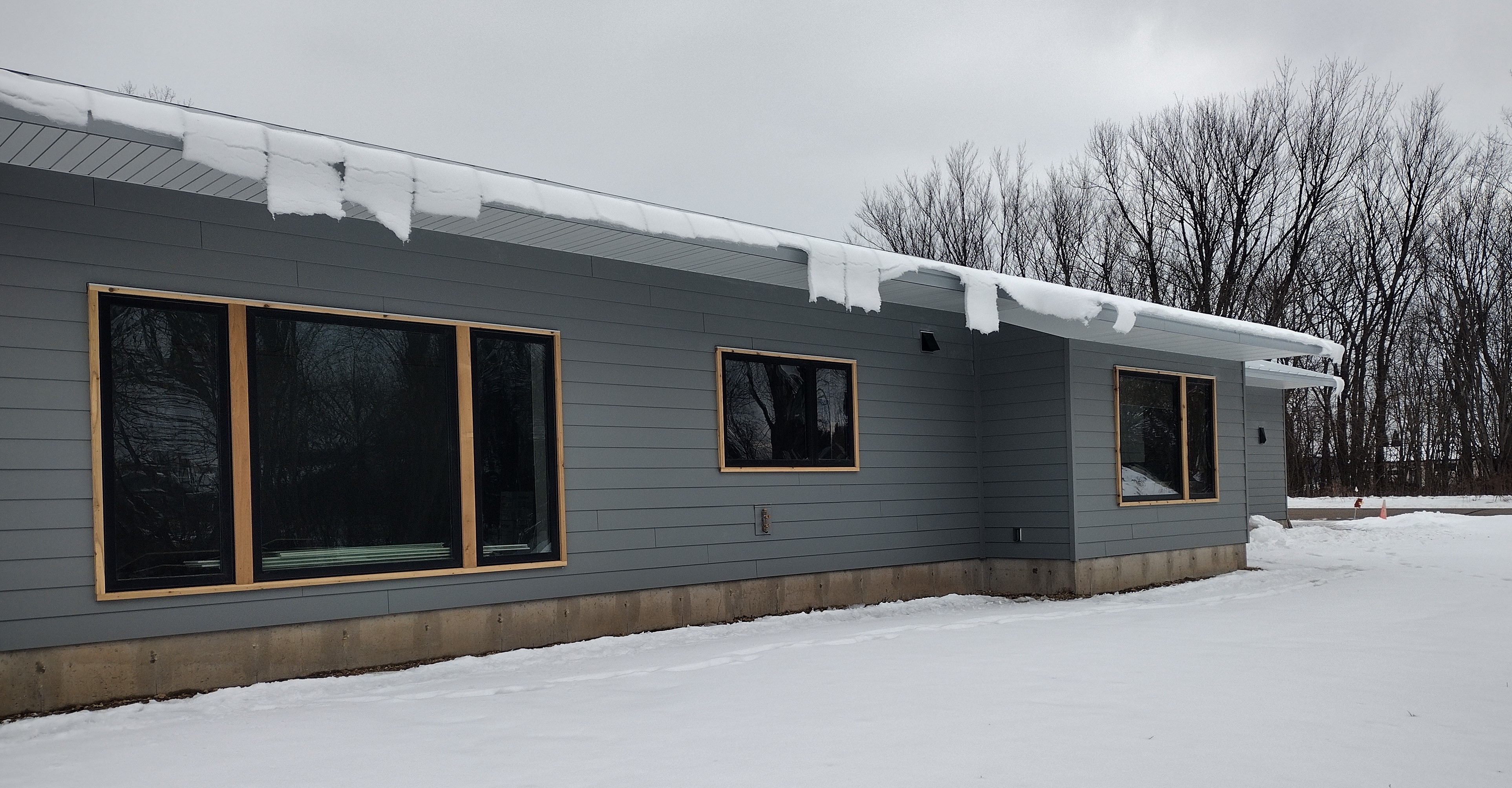 The panels were fabricated on site from rolls of stock material. I chose the “pencil rib” profile over a flat pan, for added stiffness and to conceal any “oil-canning”. I chose a galvalume finish for its authentic good looks and for its environmental qualities. Instead of a painted finish using something called a “PVDF” coating, which contains PFAS and other “forever chemicals”, galvalume is bare steel coated with an alloy of zinc and aluminum. However, it does have a clear acrylic coating of unknown impact, and the 20 year warranty on the finish is less than for PVDF. For more information see Habitable Future. As a bonus, galvalume is highly reflective and will help keep the home (and adjacent outdoor living spaces) cooler in the summer. Lots of thanks to Pete Faust and his crew for their hard work and attention to detail.