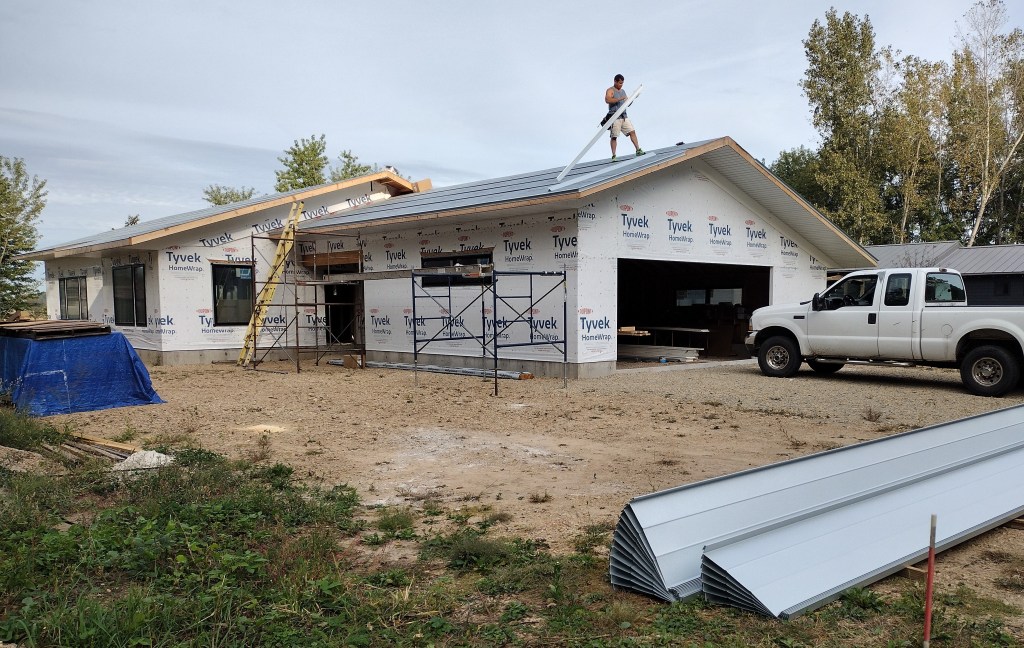 There was no debate in my mind about what type of roofing to choose: it had to be standing seam steel. This concealed fastener “snap” panel system promises to be maintenance-free and rust-free for 50 or 60 years and beyond. It pairs beautifully with PV solar panels, which will be attached to a rack system that merely clips on to the standing seams—no penetrations through the roofing will be needed. The roofing will outlast the PV solar panels. This roof is cost competitive over the long term in part because my design has no valleys, hips, dormers, or other complex shapes, the 4:12 roof pitch is walkable, and ground access is easy. Steel roofs are fireproof and very hail-resistant. While steel imposes three times the manufacturing burden on the environment compared to asphalt shingles, its longevity and the likelihood that it will be recycled at the end of its useful life may be considered an offset. See BEAM carbon calculator. We were careful to save every cut-off and scrap and send it to recycling.