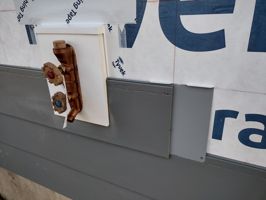 For the (hot + cold) hose bib mounts, I chose Sturdi-Mount, a one-and-done product that comes with an integral nailing flange and sloped cap (no extra flashing required). I’d purchased a variety of these mounts, hoping to use them for electrical boxes and lighting fixtures but the sizes and shapes available turned out to be too clunky for my use. Instead, the carpenters custom cut blocks of Skytrim.