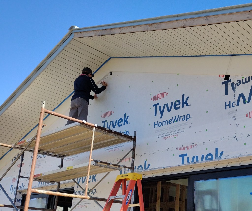 I began to regret the choice of Skytrim, not for its durability or ease-of-use, but because of the environmental impact of the product (see Habitable Future), and the hassle of painting it in the field. Here, the “weekend warrior” crew is applying blue masking tape in preparation for painting the gable end frieze boards. Only a few manufacturers formulate paint for use on PVC, and so I was not able to use a product from Ecos Paints, my preferred vendor. And if that wasn’t enough to sink the heart of this “eco-friendly” builder (me), my plan to send the cut offs to recycling turned out to be wishful thinking. I’m still hanging on to the larger scraps in hopes of using them elsewhere and am still looking around and making calls to recyclers.