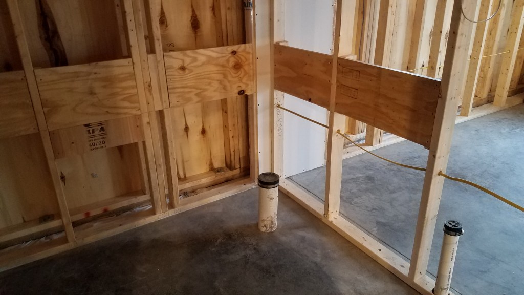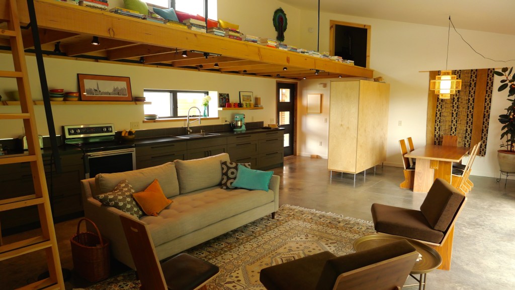 In other posts, I’ve extolled the virtues of a slab-on-grade home, but here I have to admit that it made running mechanicals harder. In a conventional home, you run freely through wall and ceiling cavities but on this job site they are “Sacred Space” reserved for insulation. You also run through the attic (none here), the basement (none here), and the floor cavities (none here). Instead, I built a chase on top of the loft floor, tucked along the back wall and out of sight from the living room below.