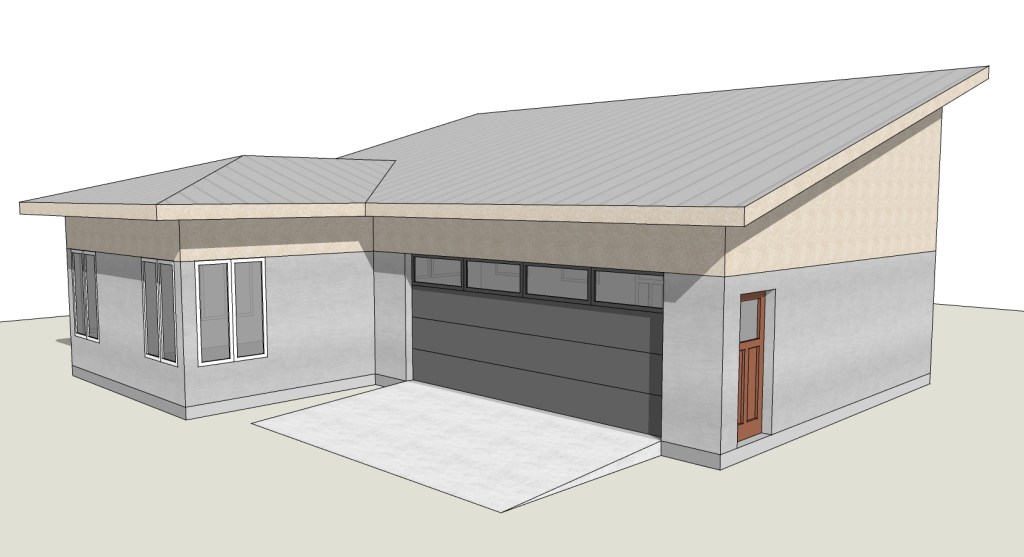 Further south and situated along a quiet street in a mid-size city, will soon be an accessible home for a single retiree. It’s an R-45 double 2×4 wall house on a slab, with an R-60 vaulted ceiling in the great room. The design is modern and bold, with a single concrete pillar holding up the front porch.