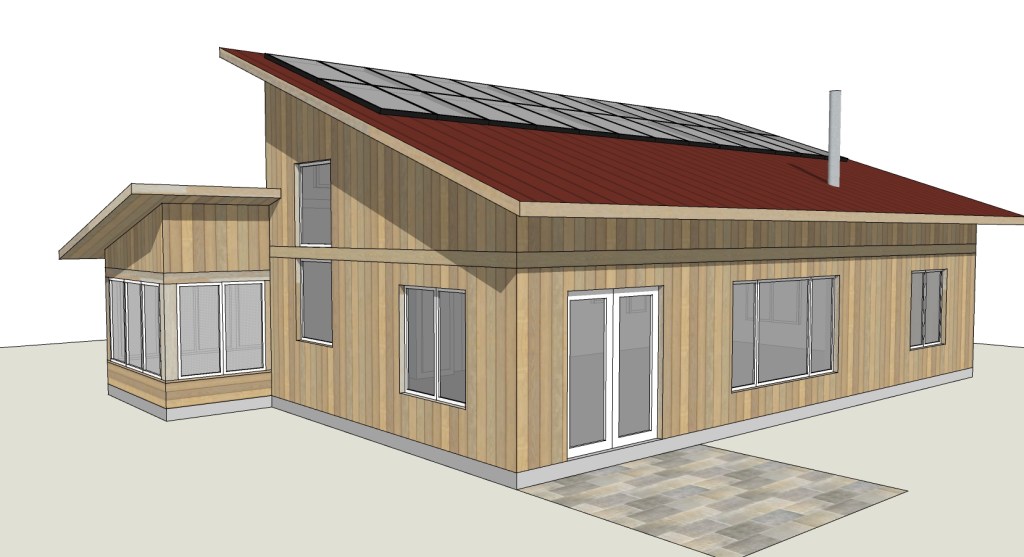 Overlooking the fields and forests of central Wisconsin, a simple and sturdy home will be built by a capable couple with young children. It’s also a double wall house on a slab with a vaulted ceiling. The exterior will be clad in “barn steel” and the south facing windows will be shaded by a wood post & beam “rooflet”. At one end of the house is a 3-season room with bi-pass windows that can be thrown open in good weather.
