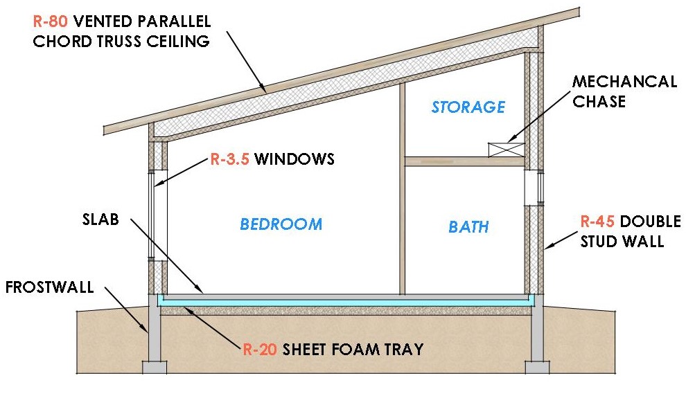 - 12″ thick double 2×4 wall with dense-pack cellulose R-45